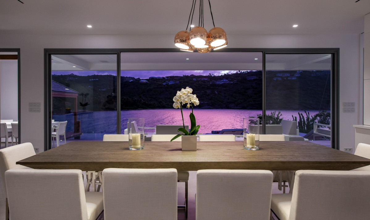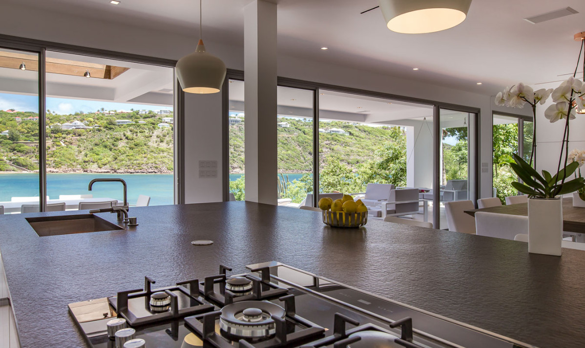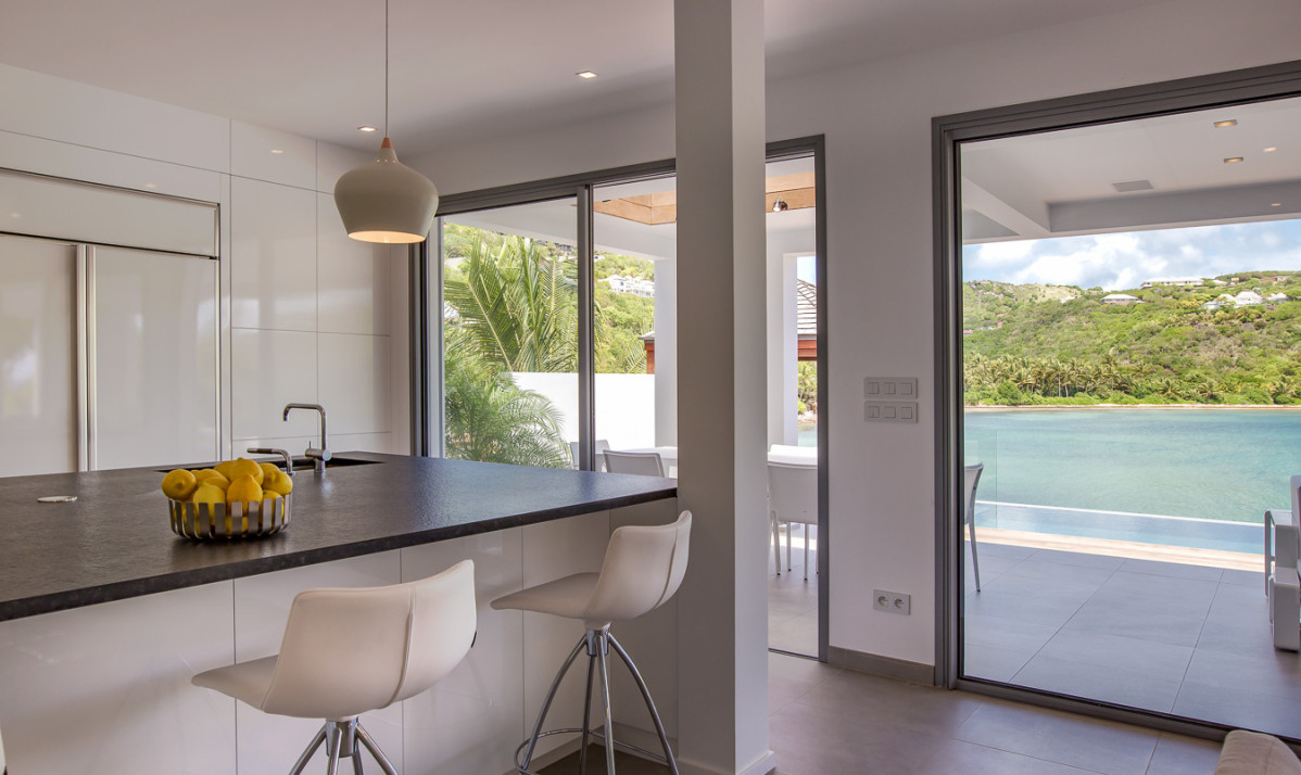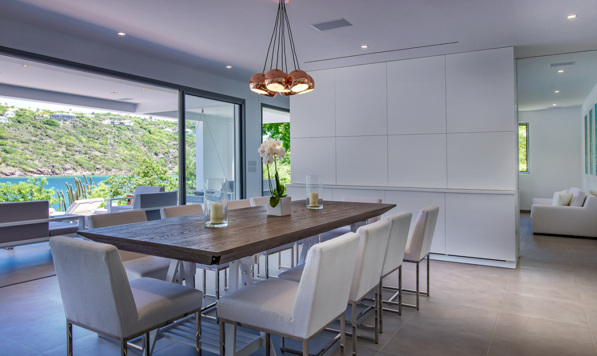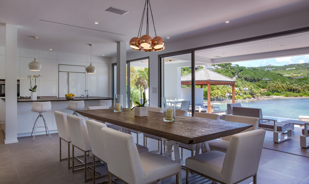 Inside, the layout of the living area provides versatility thanks to a dividing wall between the dining room and sitting room that can be retracted or closed depending on the situation, providing a more cozy space for kids or adults to watch TV. The big dining table has room for 10 to dine while enjoying the views, and the kitchen is off to the side of this space, behind a breakfast bar, and fully equipped for everyday as well as extravagant meal preparation.