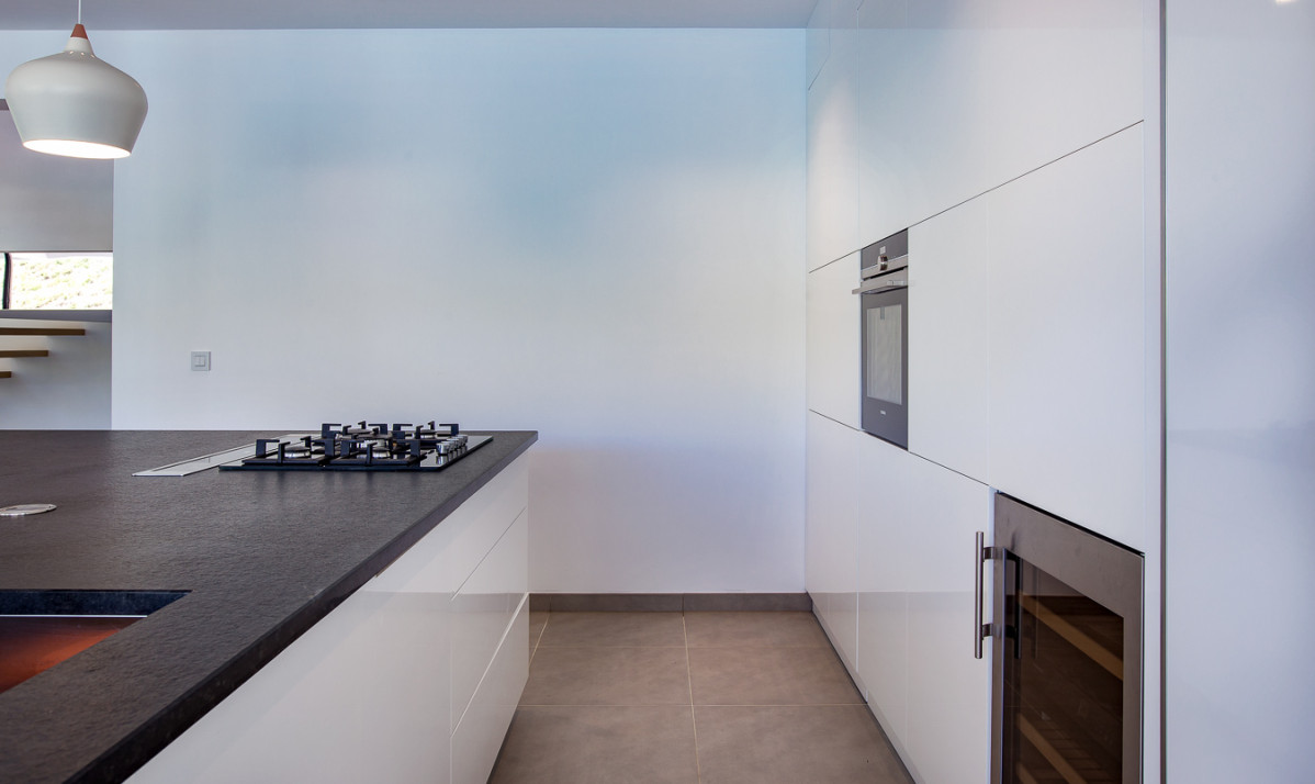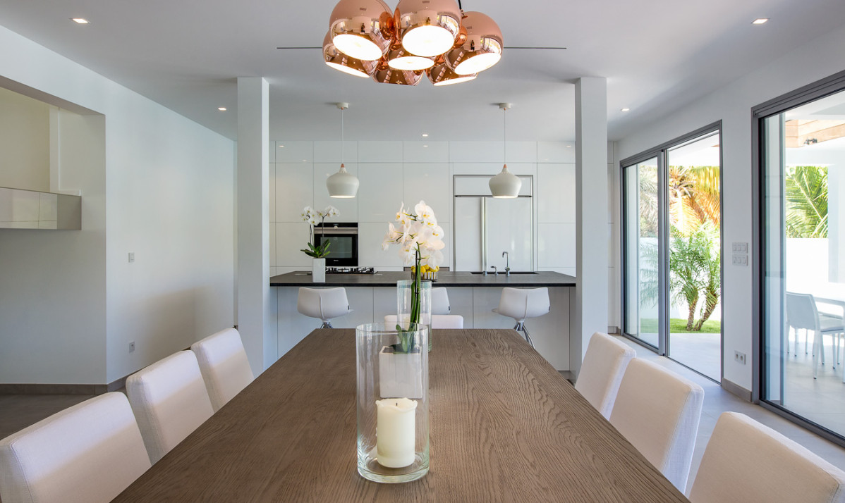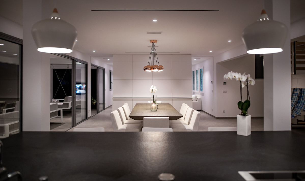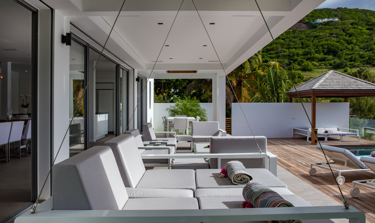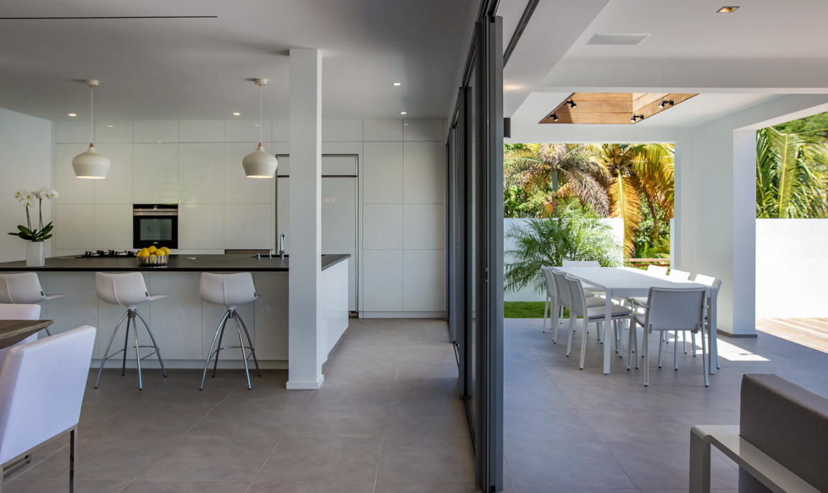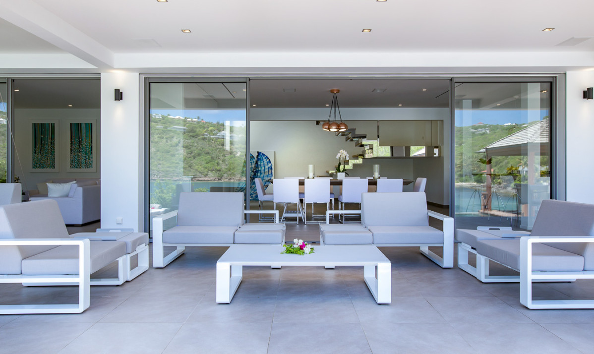 Inside, the layout of the living area provides versatility thanks to a dividing wall between the dining room and sitting room that can be retracted or closed depending on the situation, providing a more cozy space for kids or adults to watch TV. The big dining table has room for 10 to dine while enjoying the views, and the kitchen is off to the side of this space, behind a breakfast bar, and fully equipped for everyday as well as extravagant meal preparation.