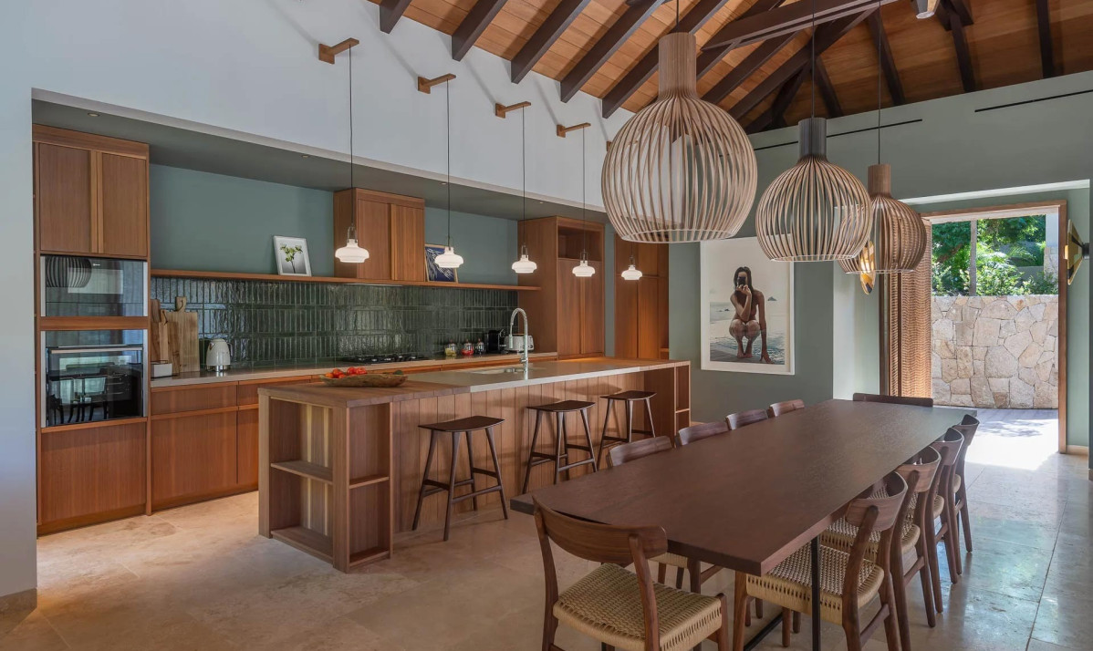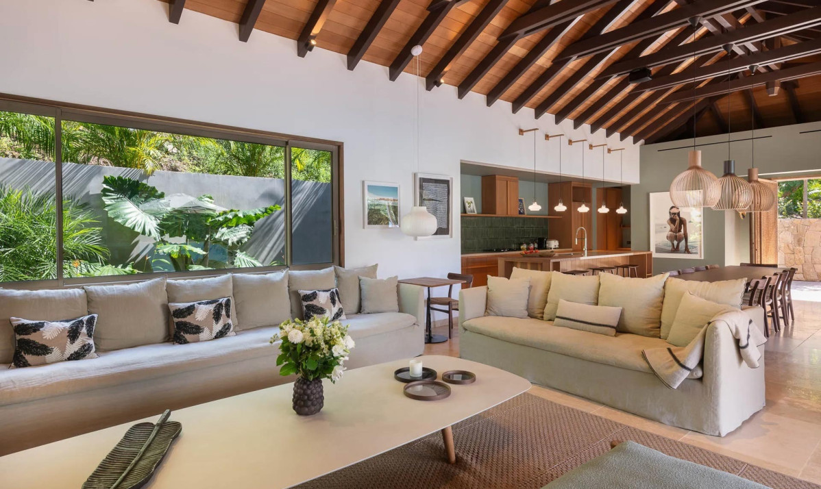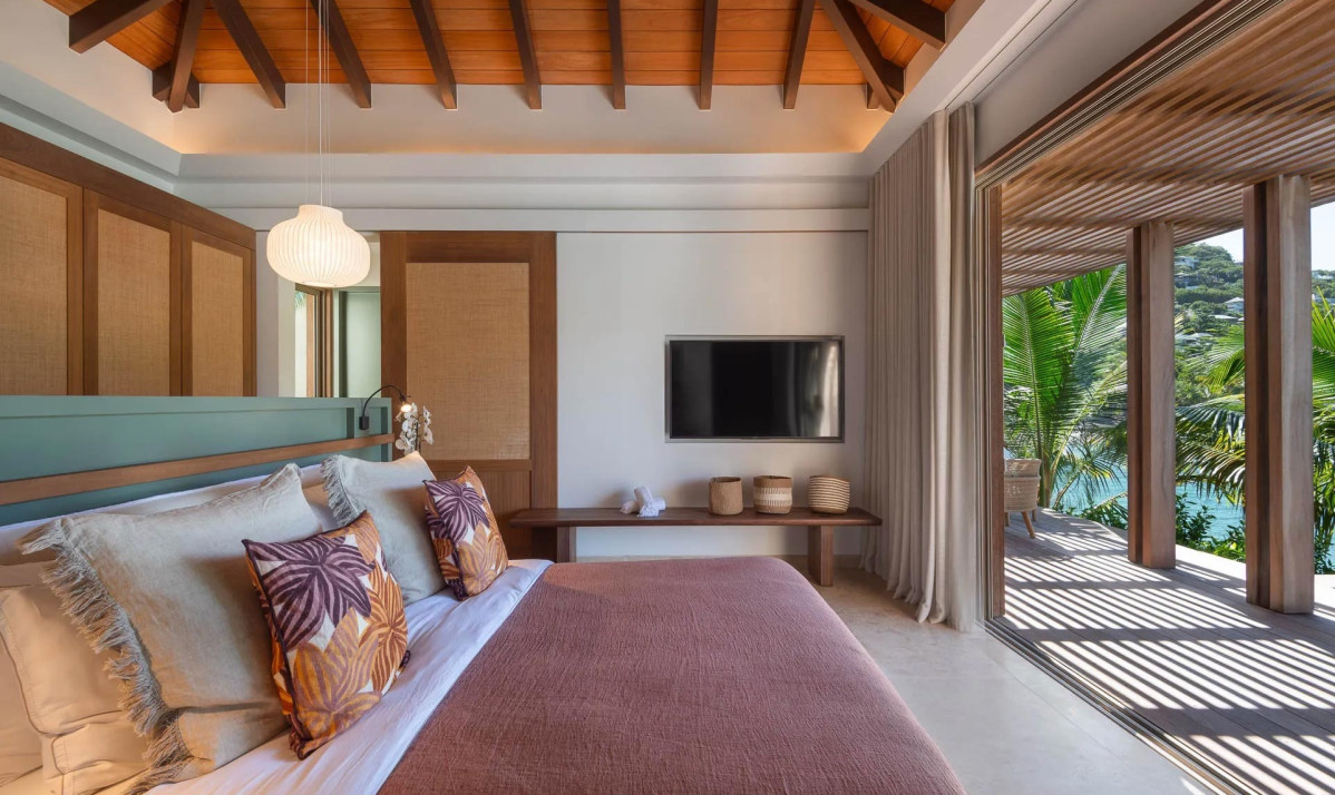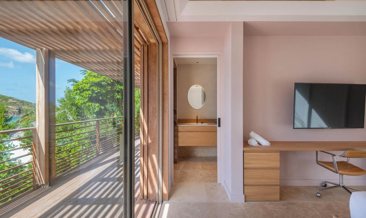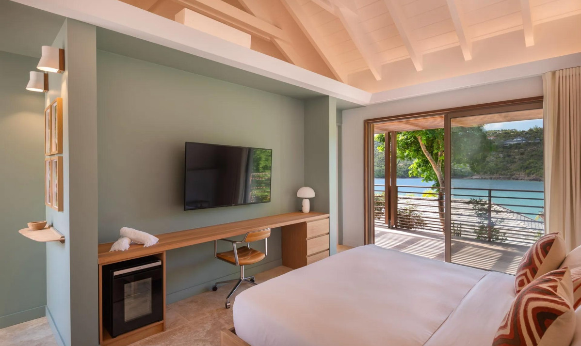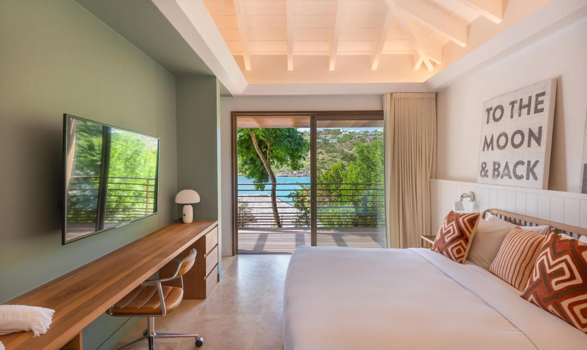 The heart of the property is a spacious, air-conditioned living room that feels open and welcoming, styled with plush sofas, ceiling fans, and large smart TVs. From here, sliding doors lead out to terraces framing views of Marigot Bay. Next to the living space is a fully outfitted gourmet kitchen and expansive counter space make it ideal for entertaining. There’s also a formal indoor dining area where the wooden table invites shared meals. On the top floor, the fitness room offers equipment for strength training, yoga, and quiet moments with ocean vistas, a tranquil spot apart from the bustle of everyday life inside the villa.