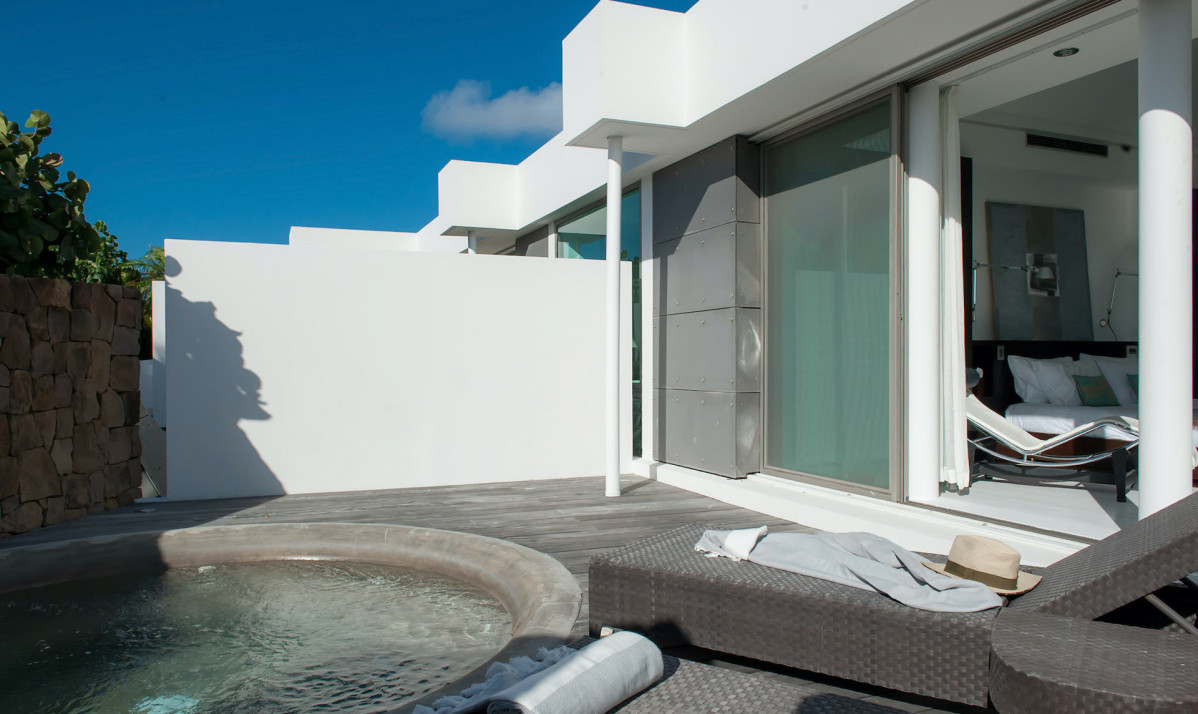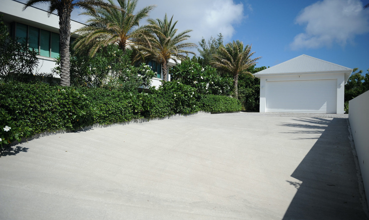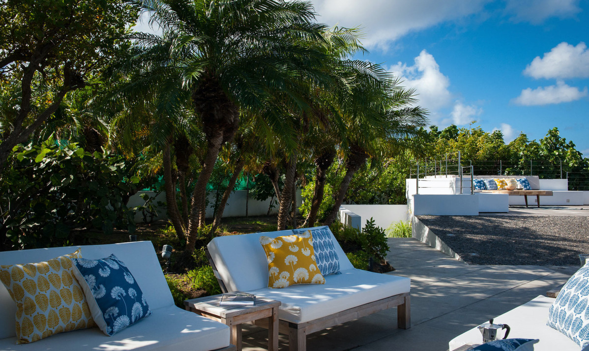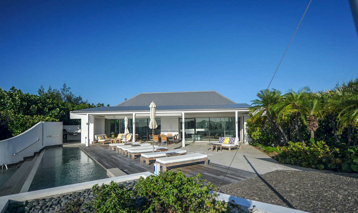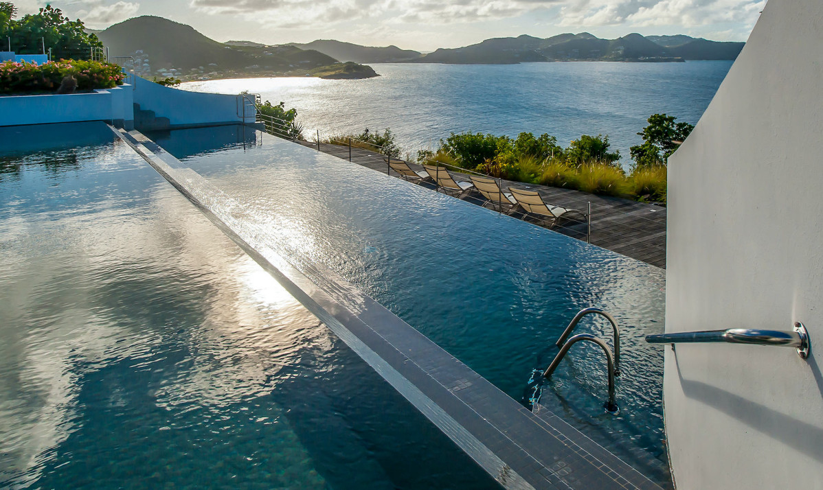 The exterior of the property features a sleek, modern design surrounded by lush tropical landscaping. Perched on the Pointe Milou ridge, it offers breathtaking ocean views from expansive terraces. The exterior includes two heated pools, one pool on main level and second pool slightly lower with spacious decks, perfect for relaxing or entertaining. Shaded lounge areas and an alfresco dining space create seamless indoor-outdoor living. The villa's gated entry and ample parking ensure privacy and security, making it an ideal retreat. Whether enjoying the sunrise or Caribbean sunsets, the villa's thoughtfully designed exterior promises a serene and exclusive island experience.