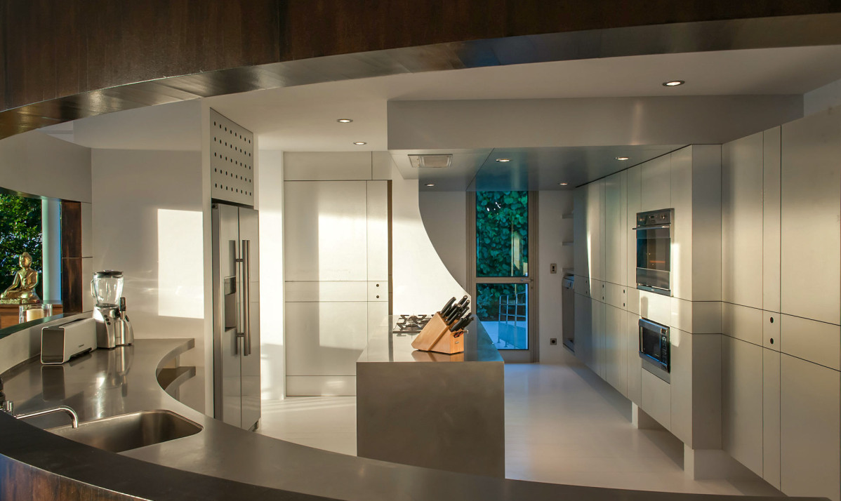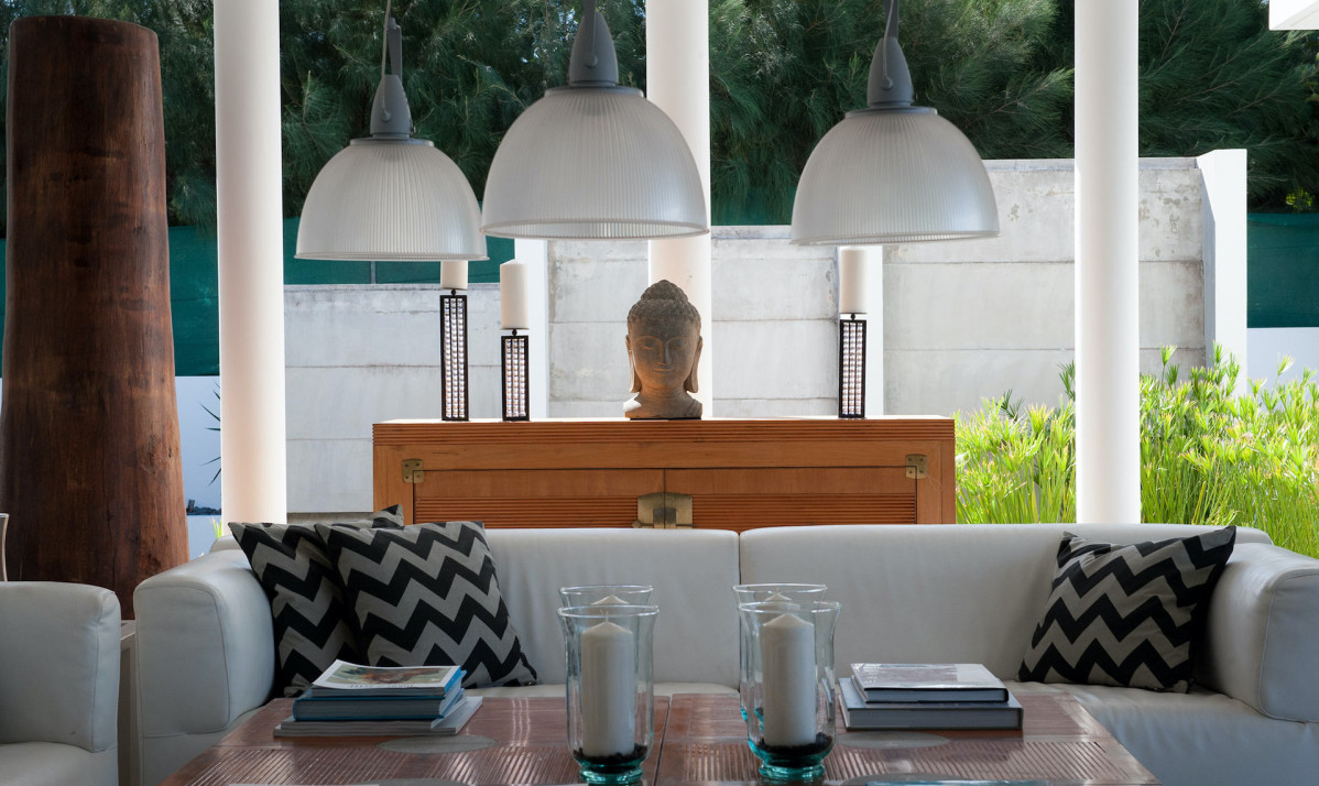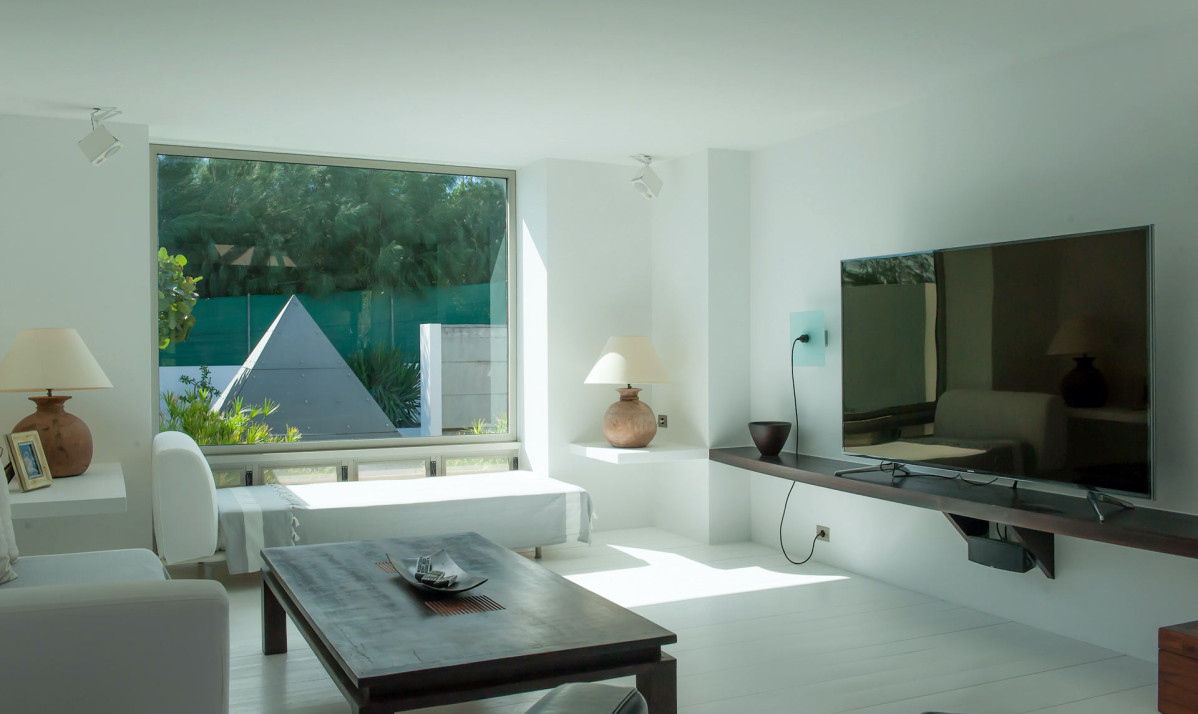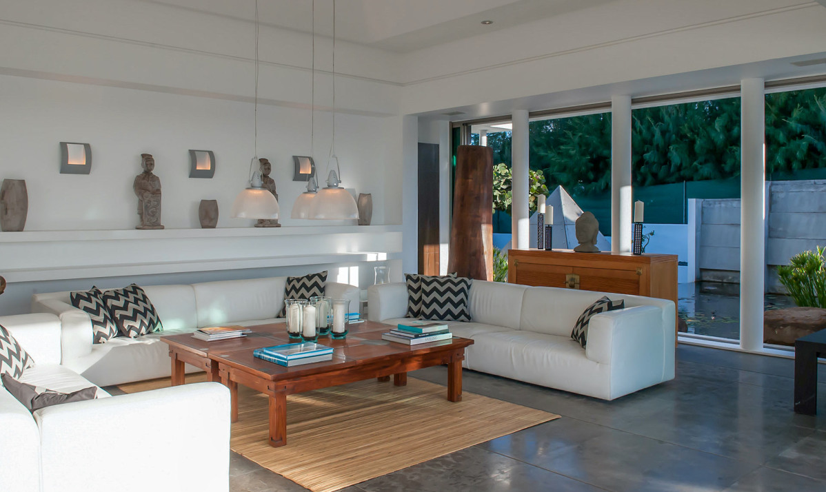 The interior of property is a blend of contemporary elegance and comfort. The spacious living room features plush seating, minimalist décor with details, and large sliding glass doors that open to the terrace, seamlessly merging indoor and outdoor spaces. The open-plan design flows into the fully equipped modern kitchen, complete with premium appliances, sleek cabinetry, and a central island perfect for casual dining. Natural light floods the space, highlighting clean lines and airy interiors. Ideal for entertaining or relaxing, the living and kitchen areas create a welcoming yet sophisticated atmosphere.