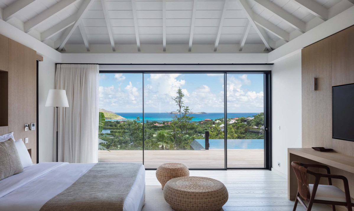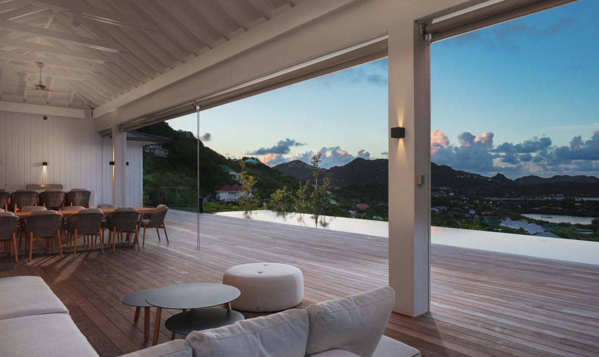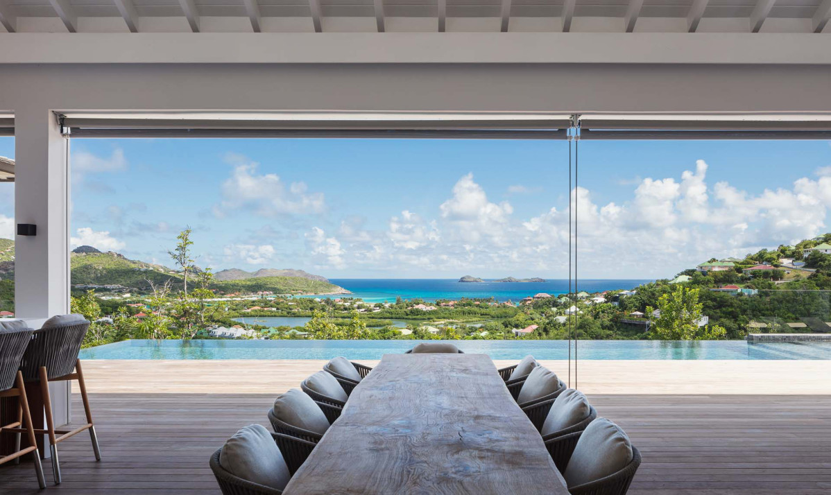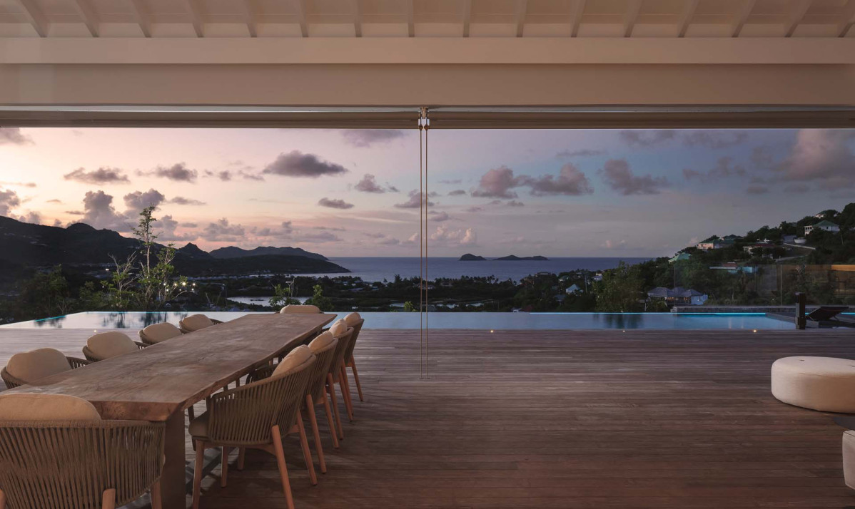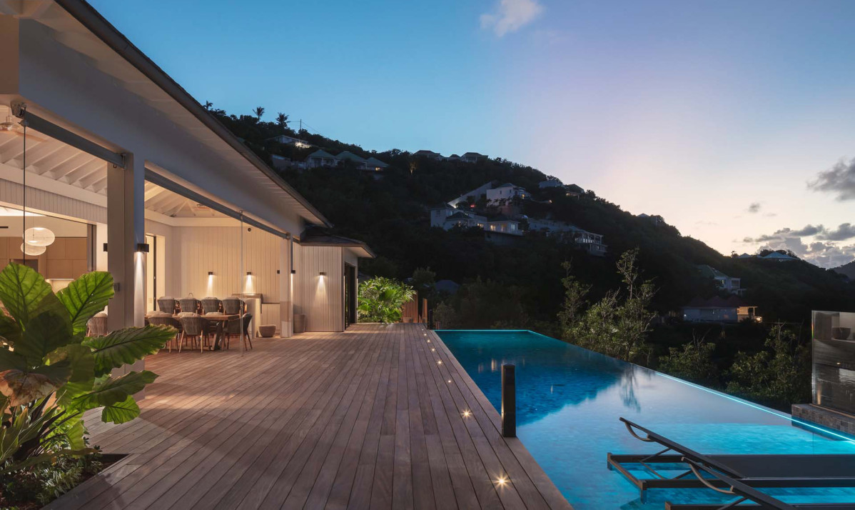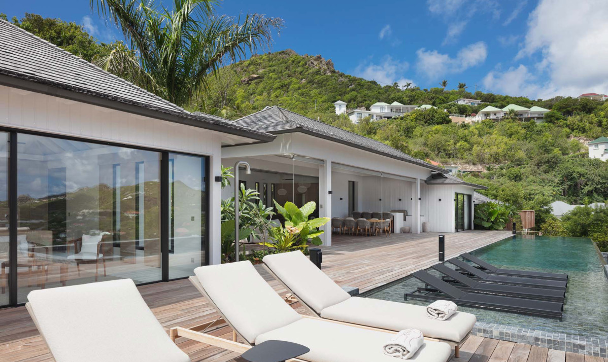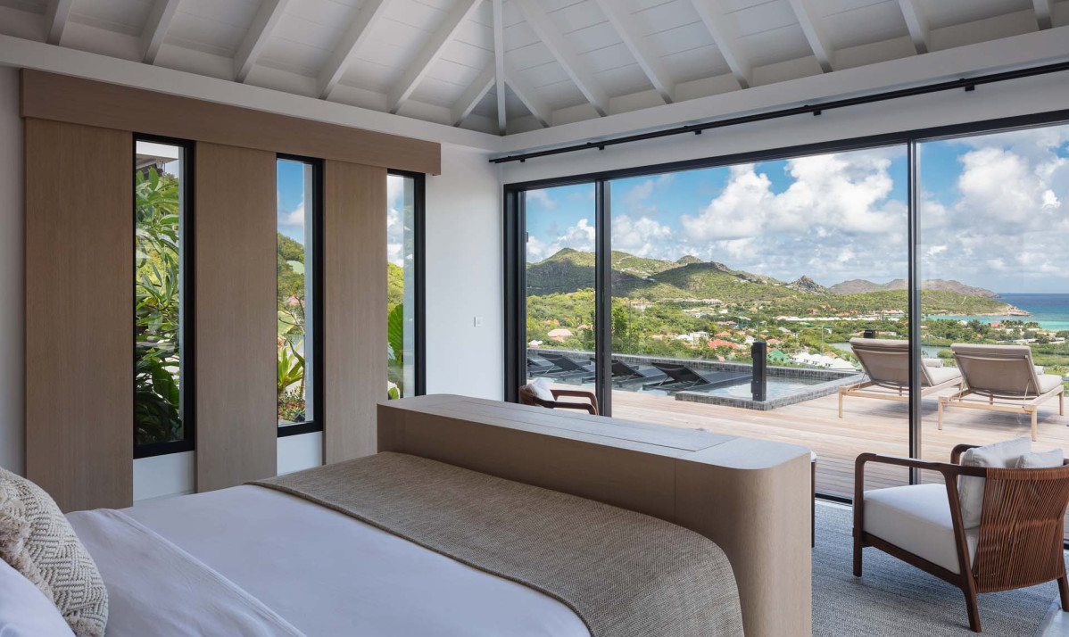 The exterior of the property perfectly captures the essence of island living, with its sleek, modern architecture complemented by natural surroundings. The villa’s expansive terrace offers multiple lounging and dining areas, making it ideal for enjoying the breathtaking views of Saint Jean Bay. The inviting infinity pool seems to merge seamlessly with the horizon, while the lush tropical gardens add to the sense of tranquility. Designed to maximize outdoor living, the villa allows guests to relax and soak in the beauty of Saint Barts in style and comfort.