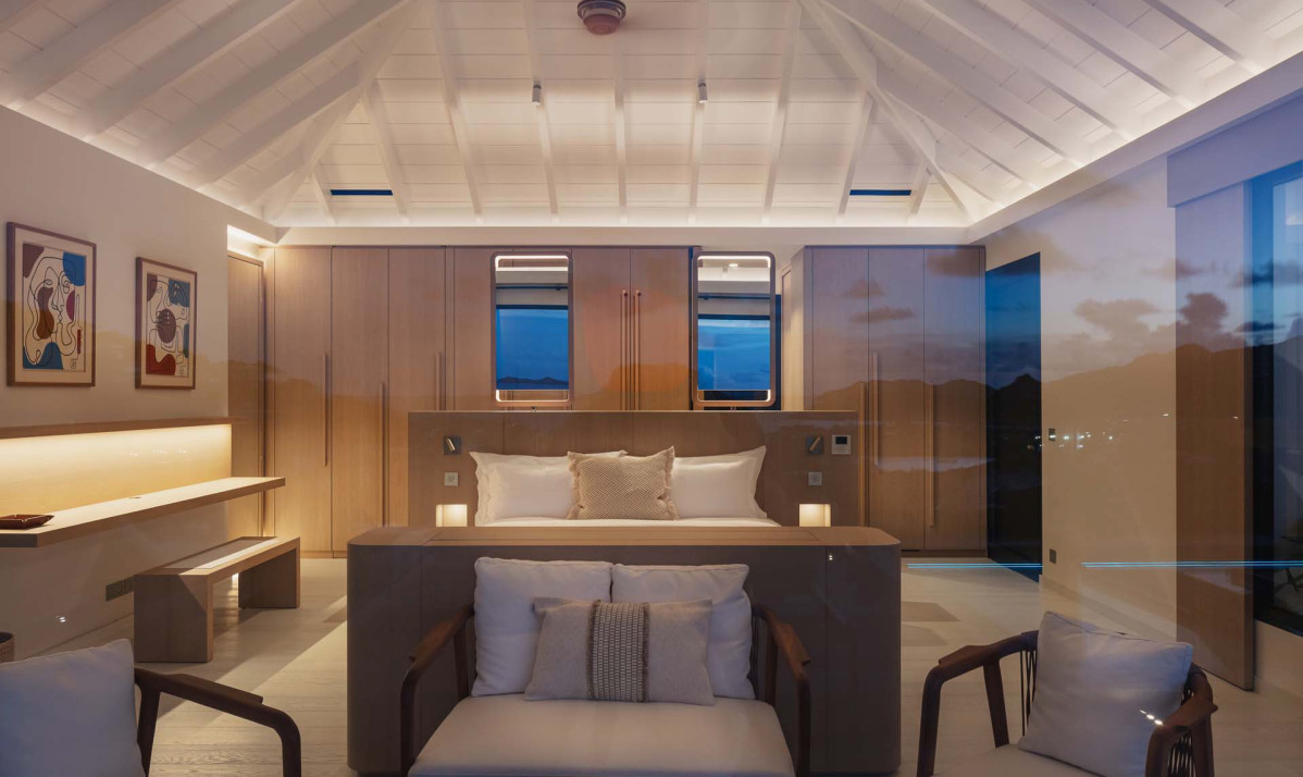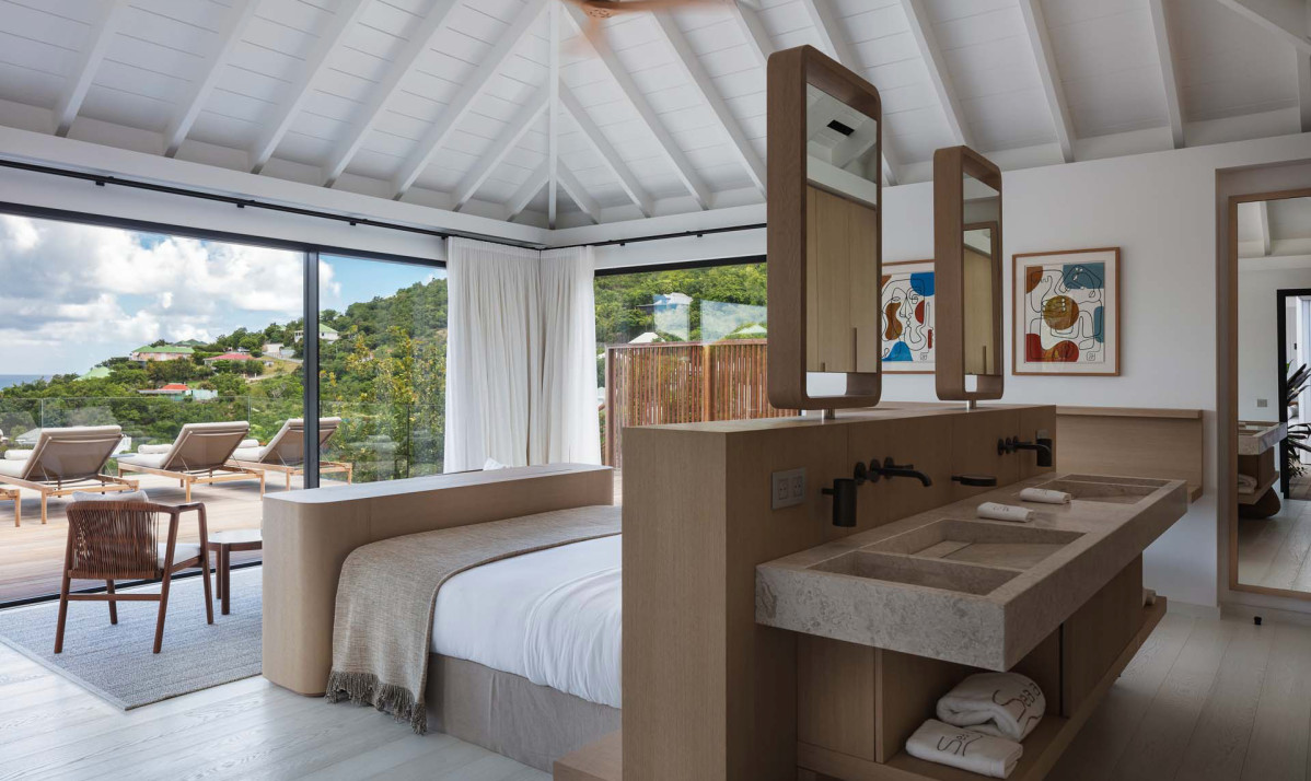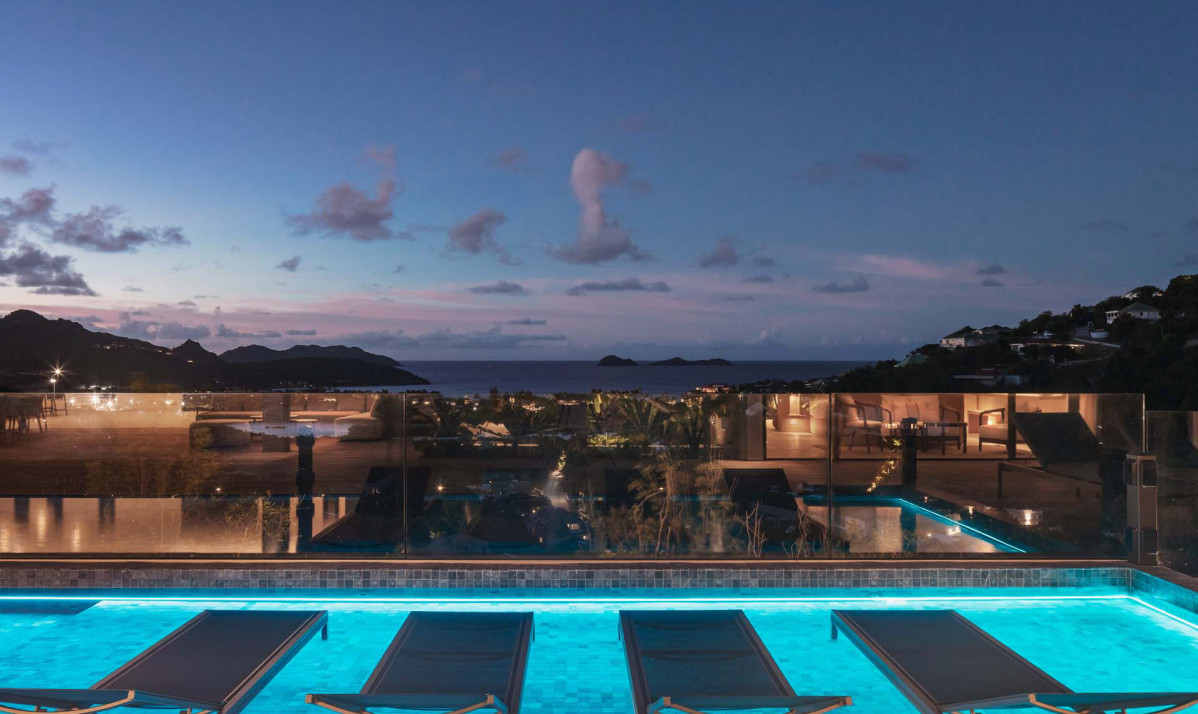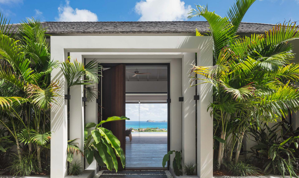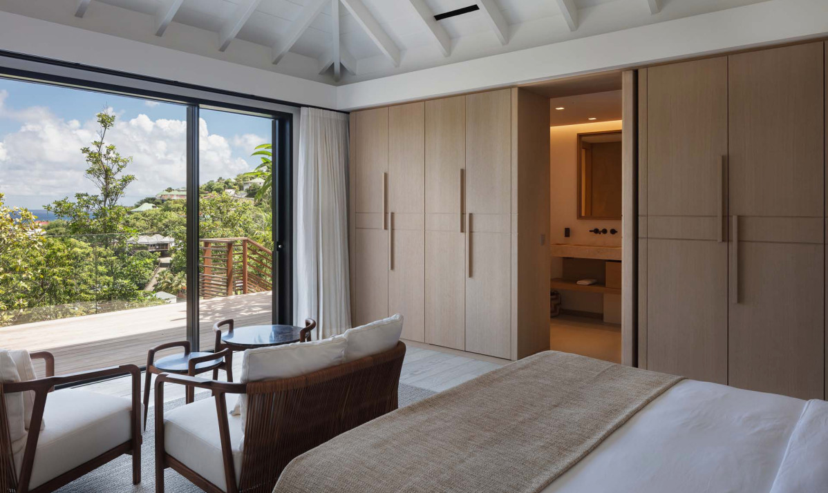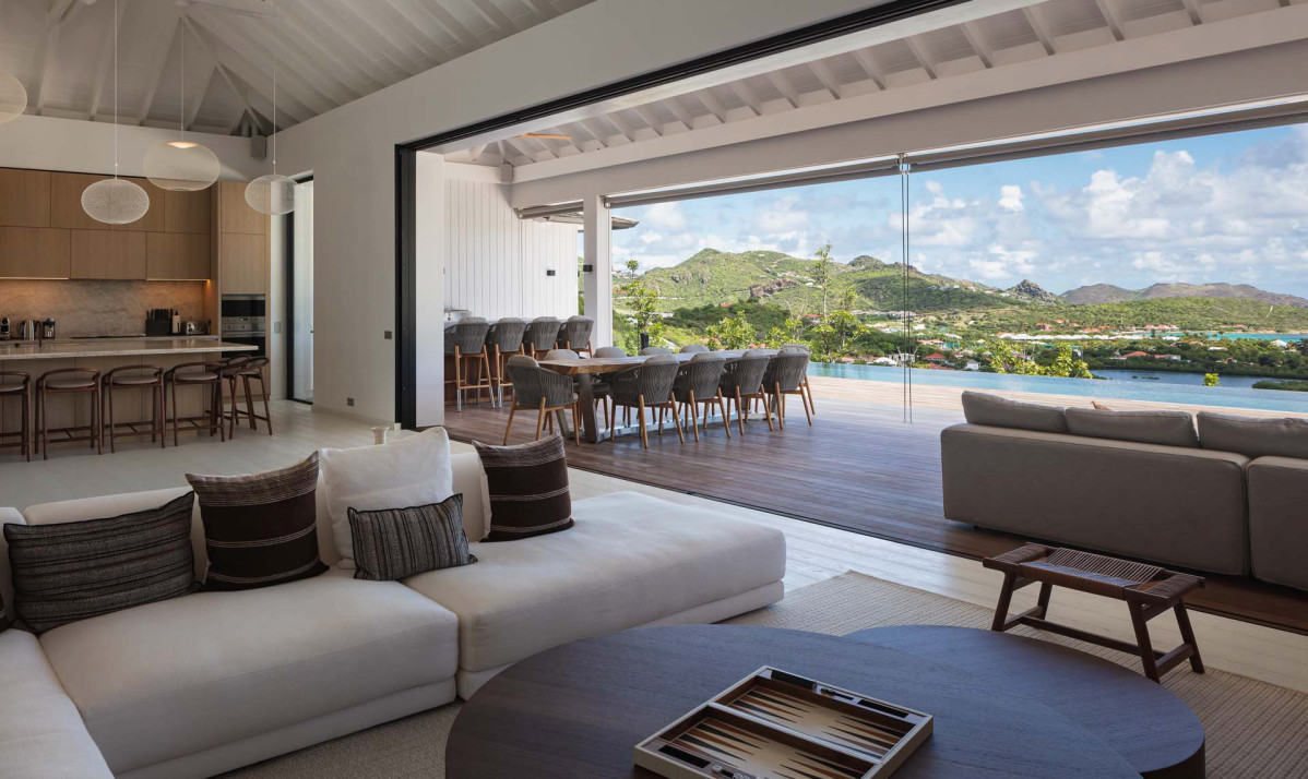 The exterior of the property perfectly captures the essence of island living, with its sleek, modern architecture complemented by natural surroundings. The villa’s expansive terrace offers multiple lounging and dining areas, making it ideal for enjoying the breathtaking views of Saint Jean Bay. The inviting infinity pool seems to merge seamlessly with the horizon, while the lush tropical gardens add to the sense of tranquility. Designed to maximize outdoor living, the villa allows guests to relax and soak in the beauty of Saint Barts in style and comfort.