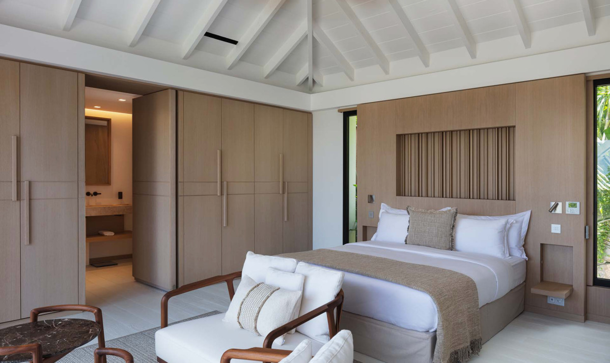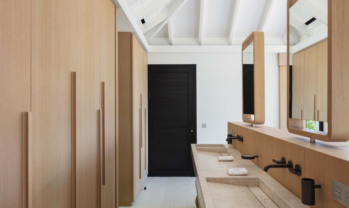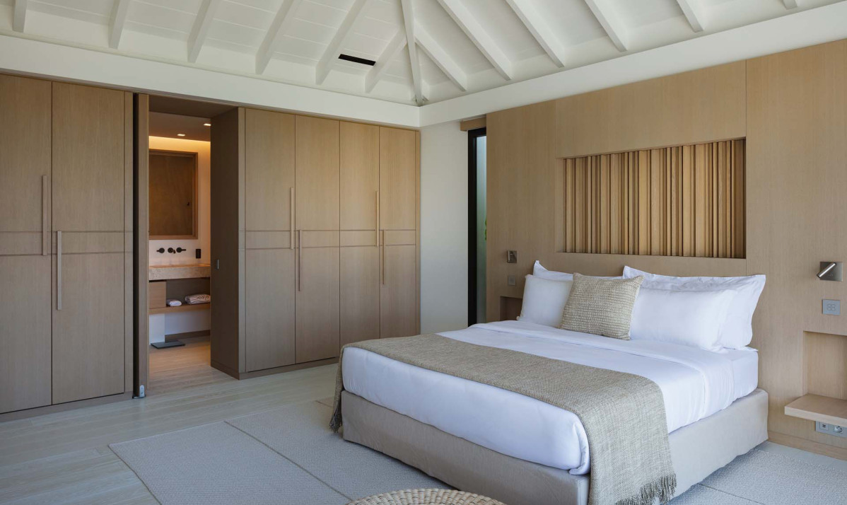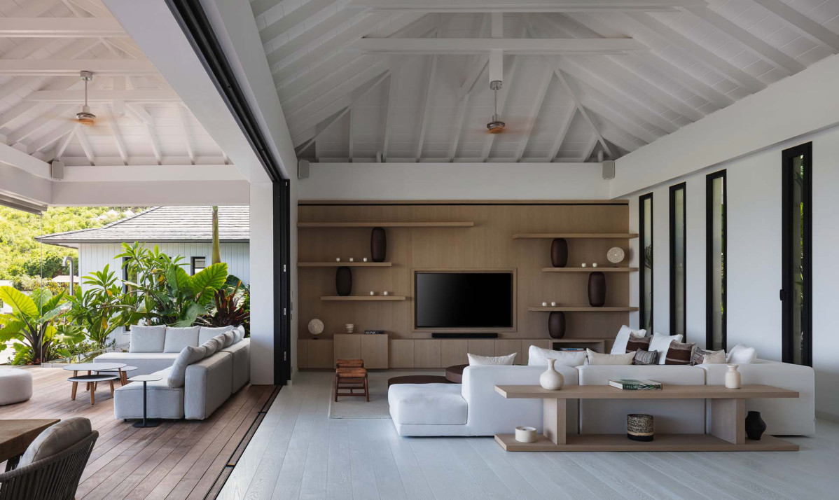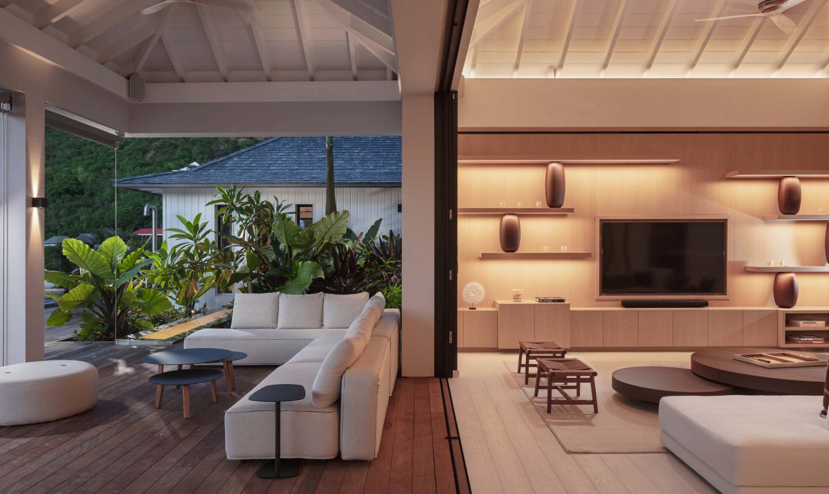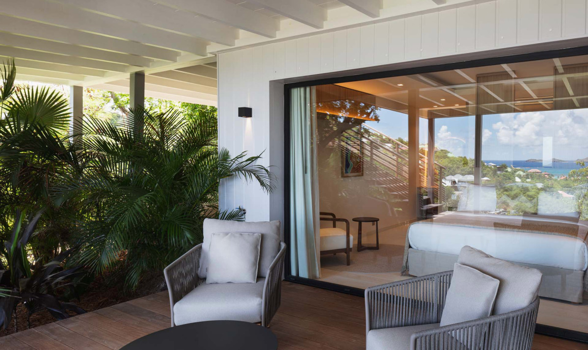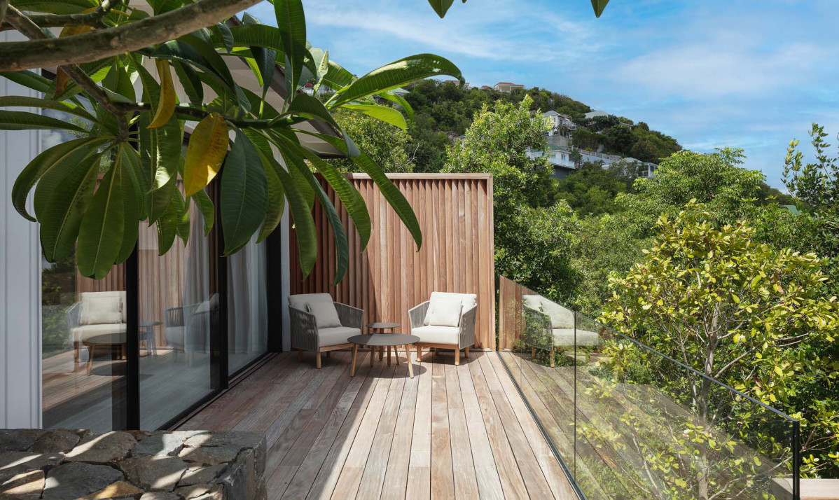 The exterior of the property perfectly captures the essence of island living, with its sleek, modern architecture complemented by natural surroundings. The villa’s expansive terrace offers multiple lounging and dining areas, making it ideal for enjoying the breathtaking views of Saint Jean Bay. The inviting infinity pool seems to merge seamlessly with the horizon, while the lush tropical gardens add to the sense of tranquility. Designed to maximize outdoor living, the villa allows guests to relax and soak in the beauty of Saint Barts in style and comfort.