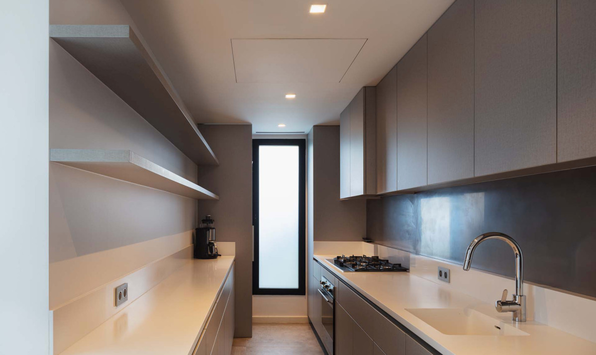 The living room offers a sleek and inviting space, featuring modern furnishings and large glass doors that open directly onto the terrace, allowing for a seamless indoor-outdoor flow. Natural light floods the room, highlighting its contemporary design and airy feel, making it a perfect spot for relaxation or socializing. The adjacent kitchen is fully equipped with top-of-the-line appliances, designed for both functionality and style. With its open layout, the kitchen flows effortlessly into the living space, making it ideal for preparing meals while enjoying time with family and friends.