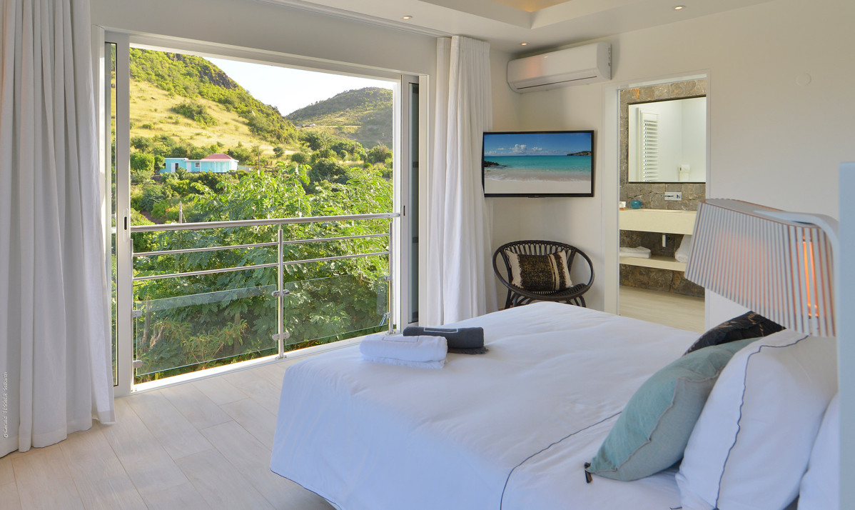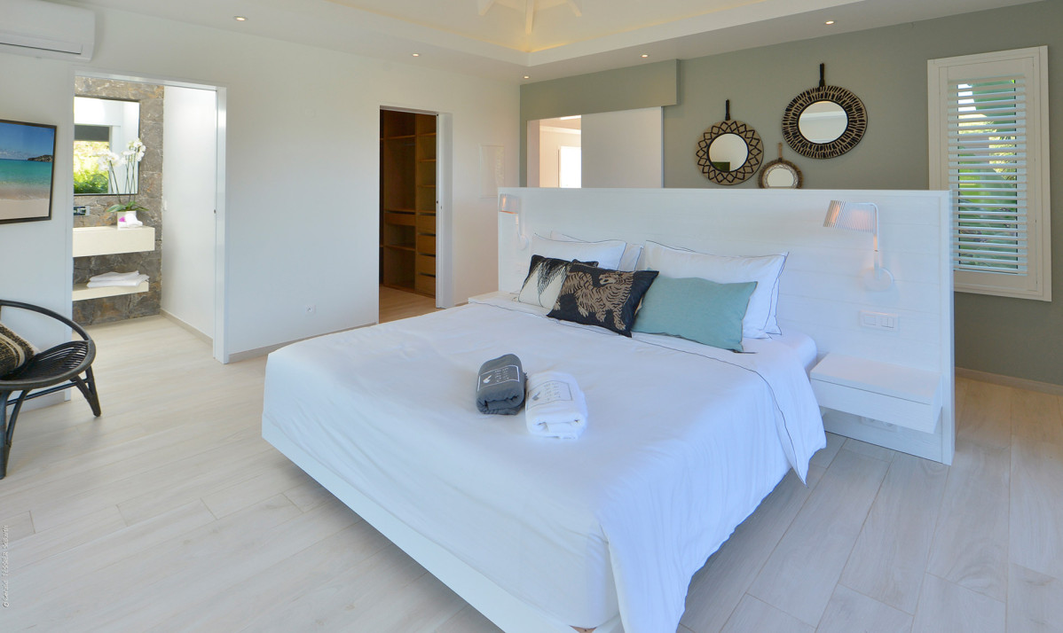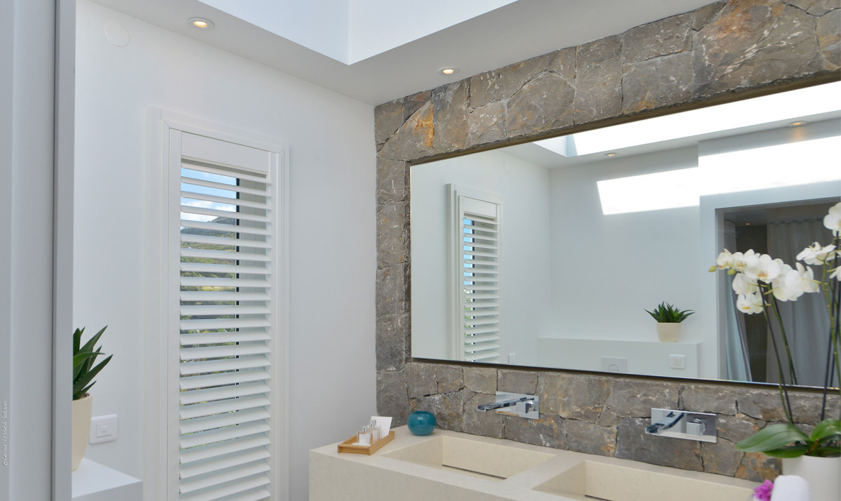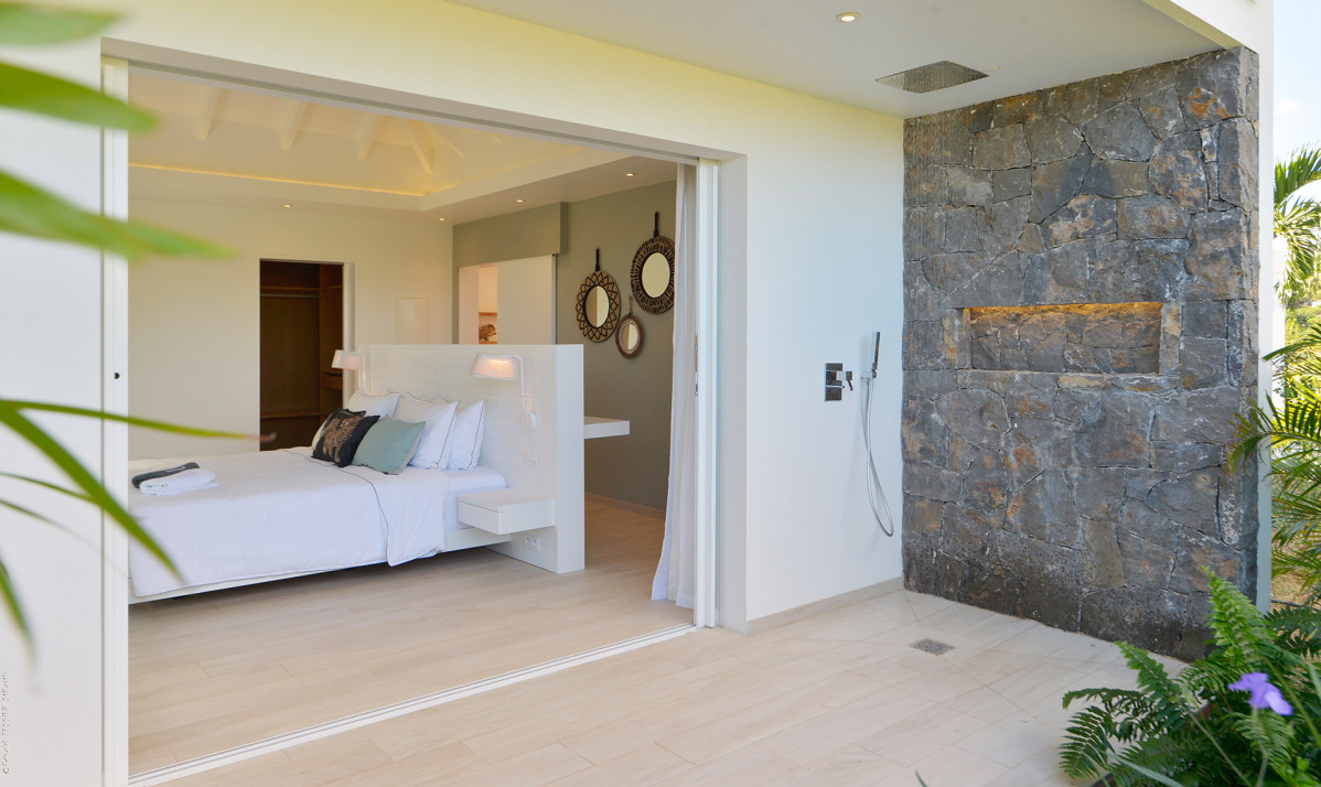The two bedrooms lead off from the central living area. The Master Bedroom boasts enviable views over the bay and has direct access to the terrace and pool. It’s a spacious and bright room that tempts you to stay and relax just a little longer. Bedroom two is of a similar size and has large dual aspect sliding doors, one of which opens to a Juliet balcony and has views over lush tropical plants and trees. The other aspect opens to an outdoor shower, and both bedrooms have their own private ensuite bathrooms and walk-in closets.