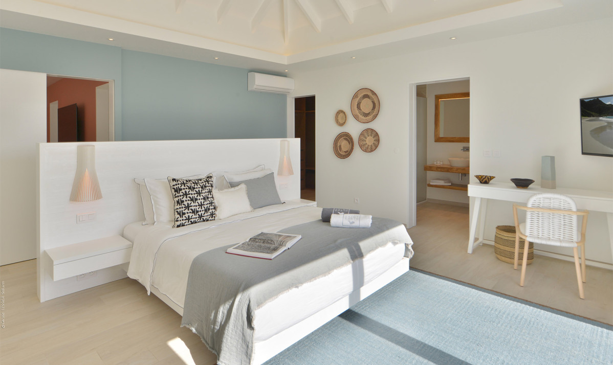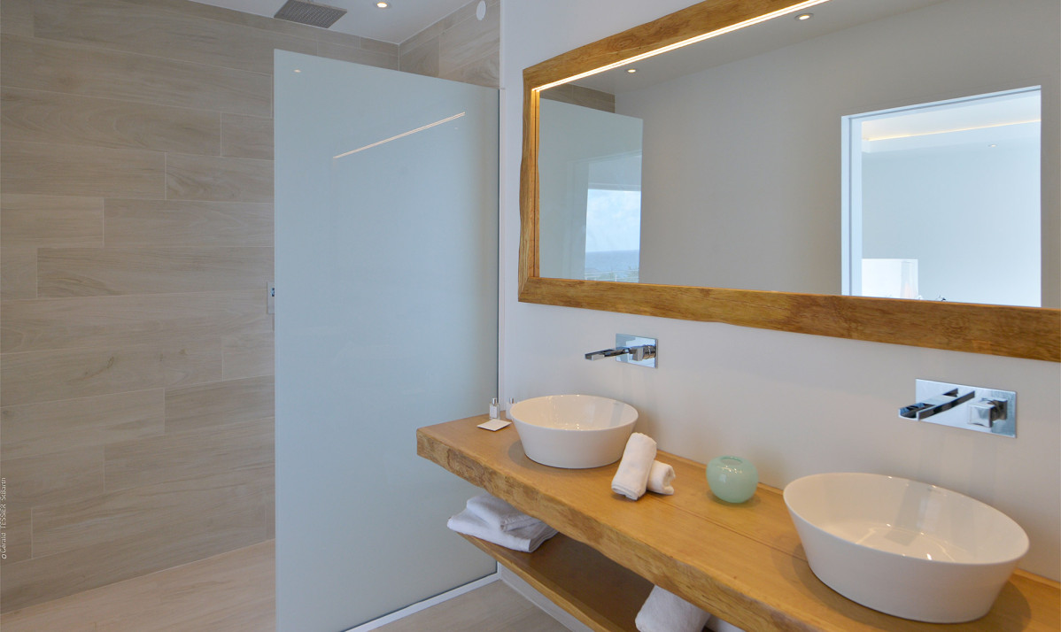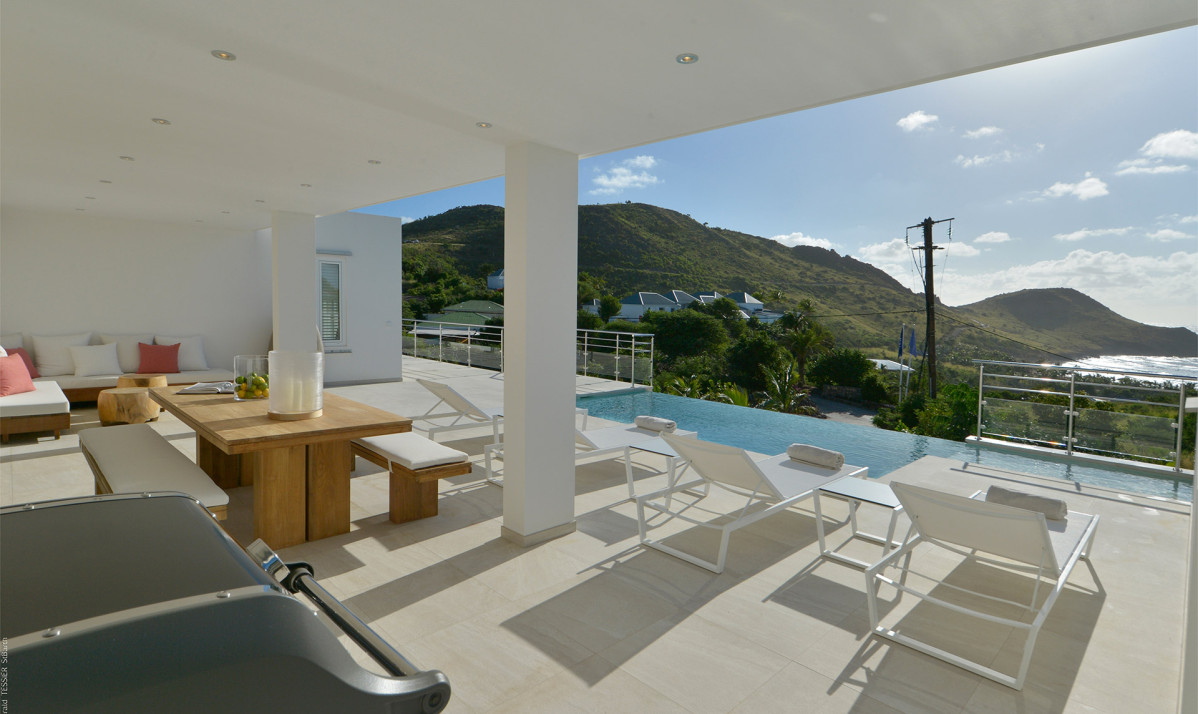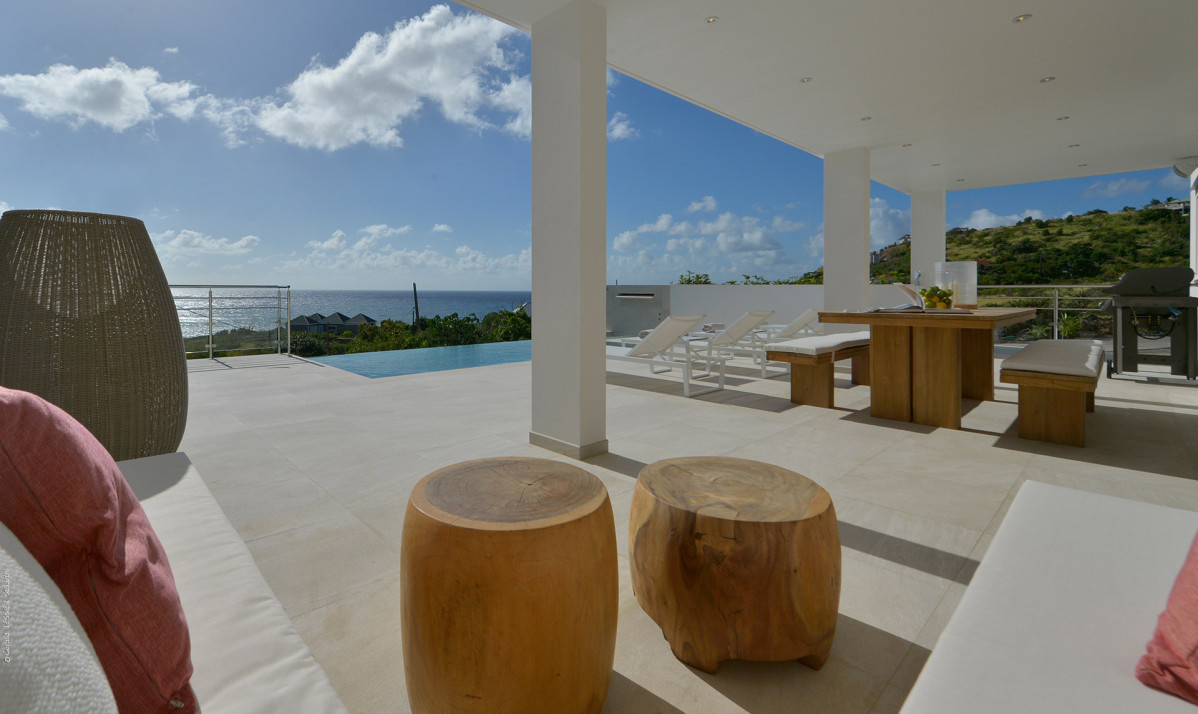 The rear façade of Villa South Wave is more Hollywood Hills than Toiny hills, with its clean lines and flat roof line, but this cleverly designed modern villa skillfully combines traditional Caribbean elements too, such as the weathered gray pyramid roofs that are set slightly back from the edges of the roof. The central infinity pool opens the view out to Toiny Bay and there’s ample space for lounging in the sun. A covered terrace extends the living area of the villa with an inviting seating area to one end, and a large natural wood dining table with benches at the other, close to the barbecue.