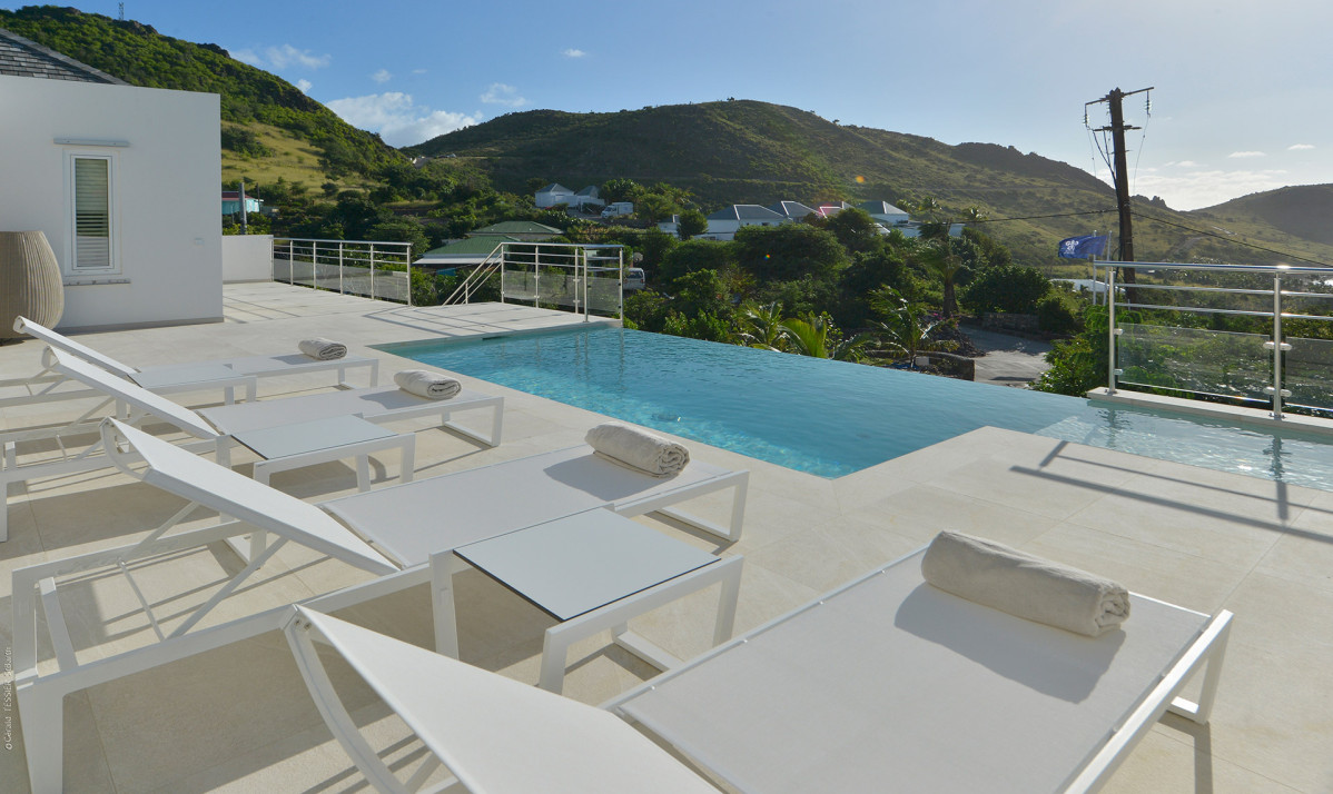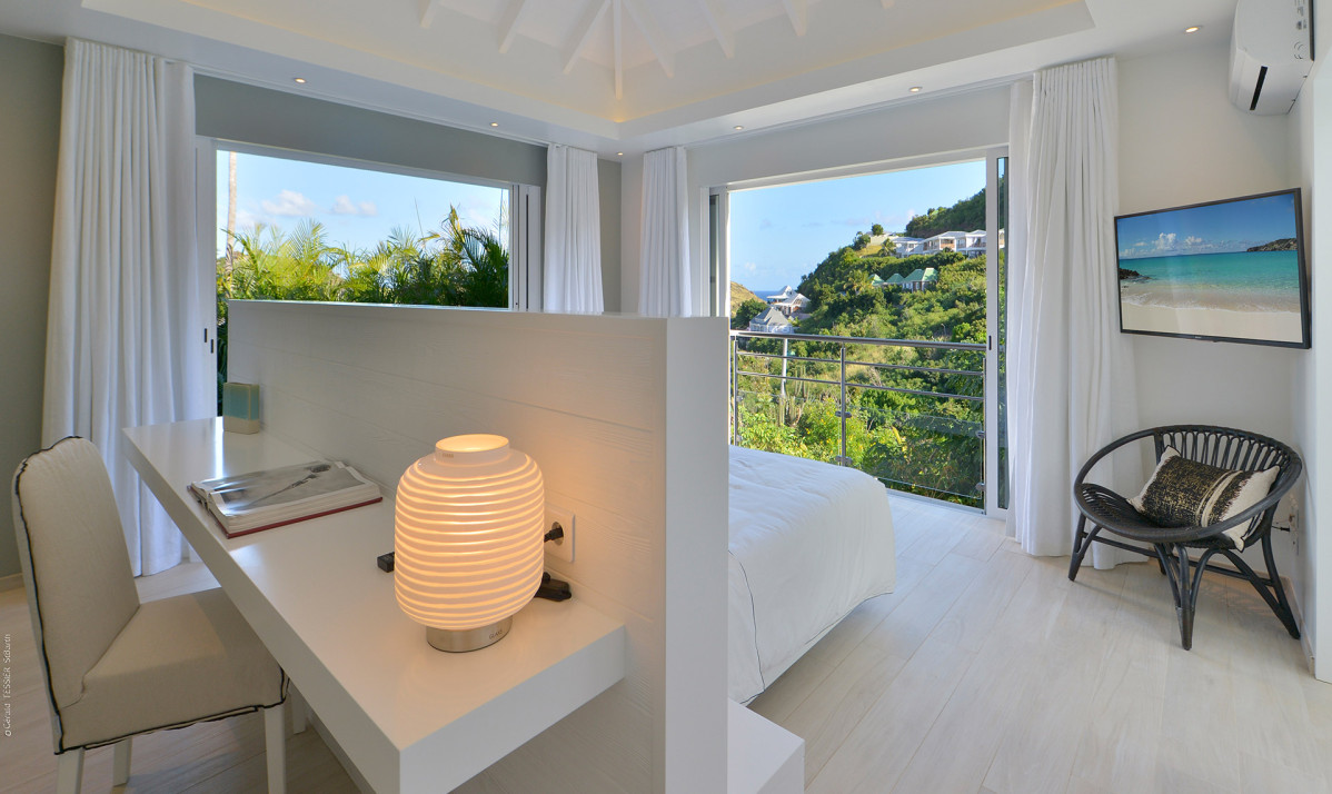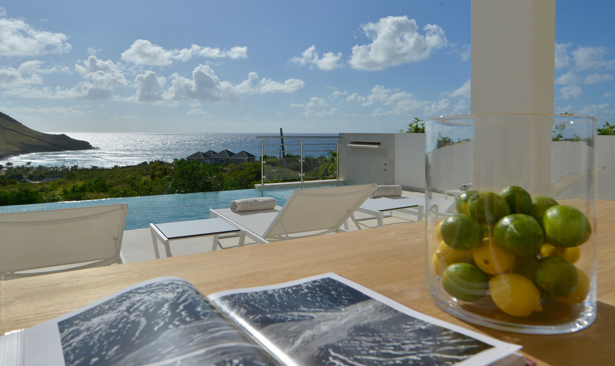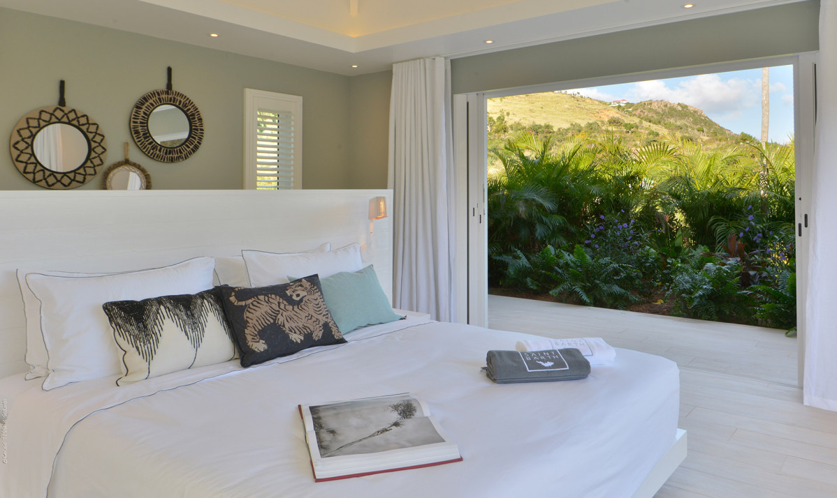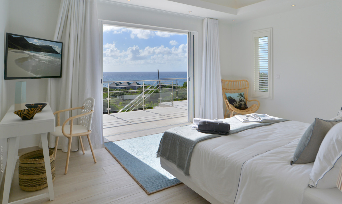 The rear façade of Villa South Wave is more Hollywood Hills than Toiny hills, with its clean lines and flat roof line, but this cleverly designed modern villa skillfully combines traditional Caribbean elements too, such as the weathered gray pyramid roofs that are set slightly back from the edges of the roof. The central infinity pool opens the view out to Toiny Bay and there’s ample space for lounging in the sun. A covered terrace extends the living area of the villa with an inviting seating area to one end, and a large natural wood dining table with benches at the other, close to the barbecue.