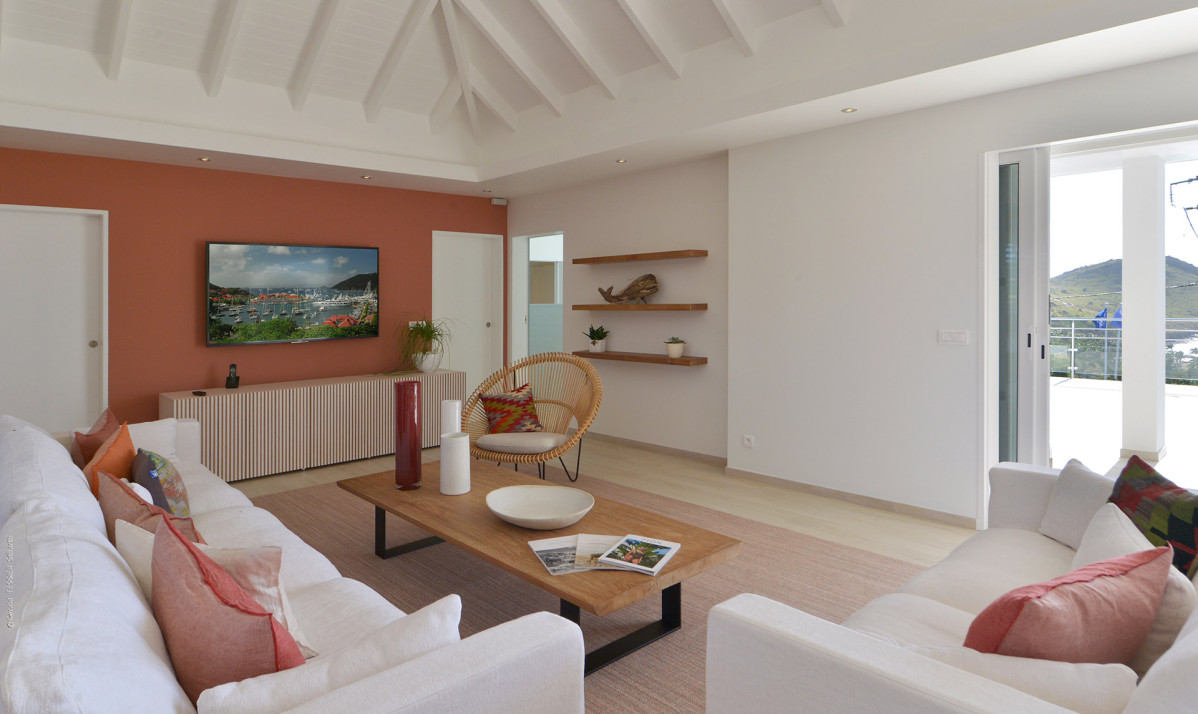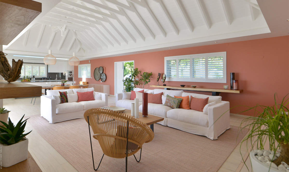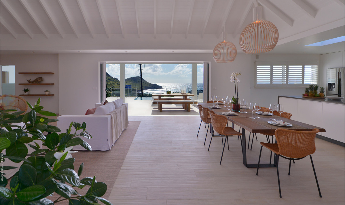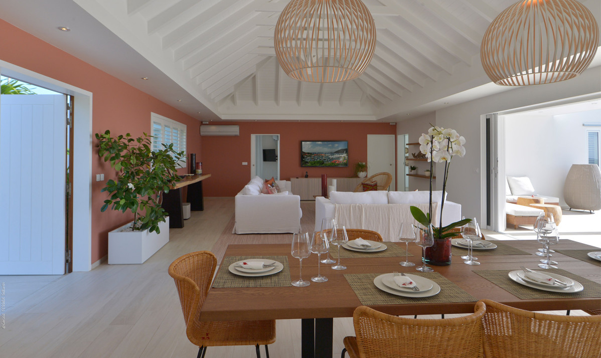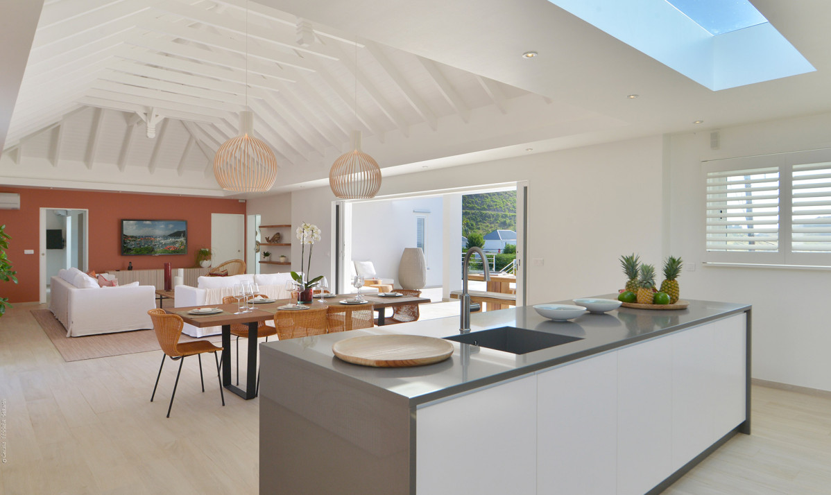 The indoor living room is very spacious. A vaulted white wood ceiling, typical for St Barts, opens the space even more and promotes the bright and welcoming atmosphere, as does the warm color tone along the rear wall. Echoing the setup outside, there is a zone for relaxing and socializing at one end of the room with sofas and a TV, then the indoor dining table. The large and modern kitchen, at the opposite end, is fronted by an island and has everything guests need.
