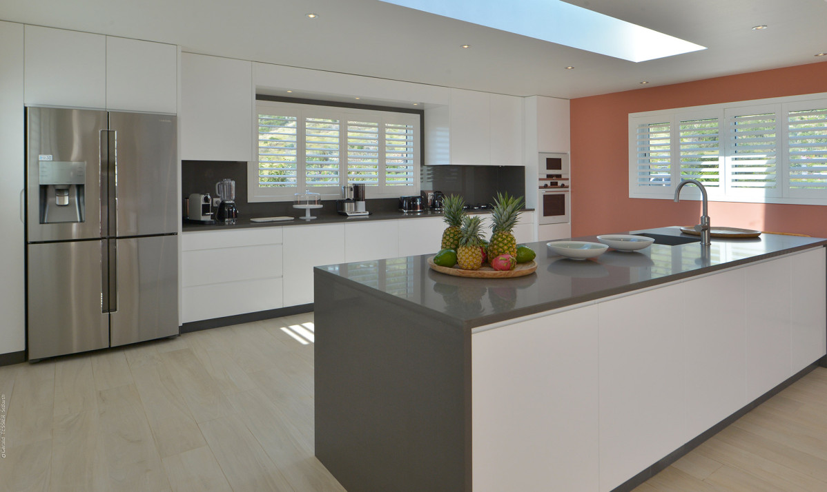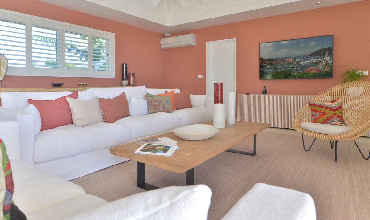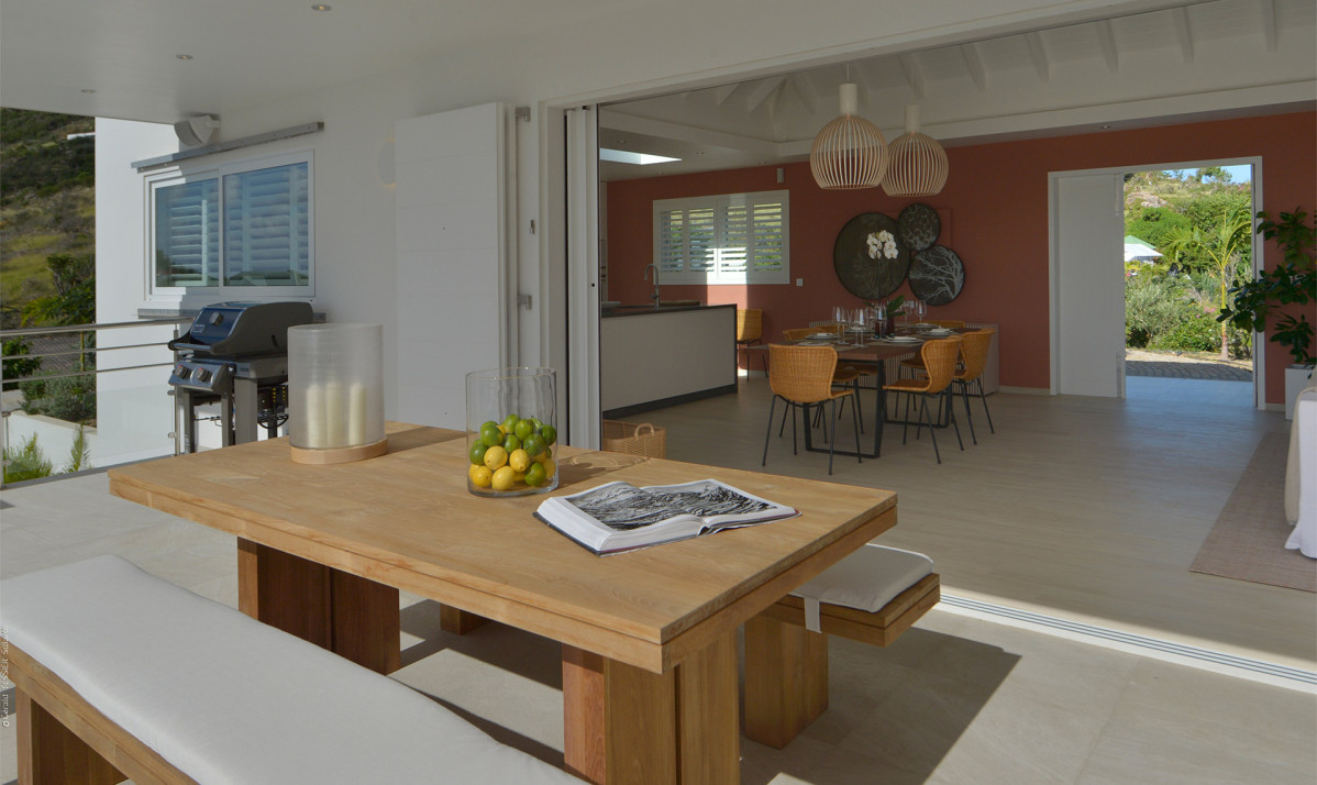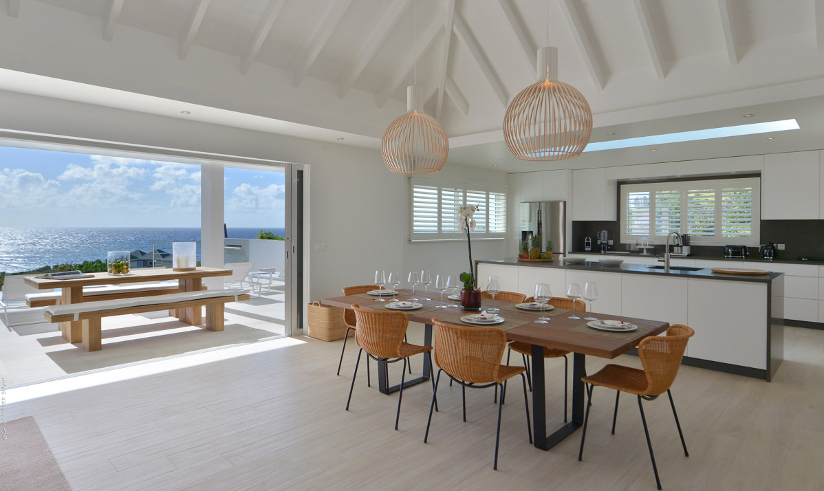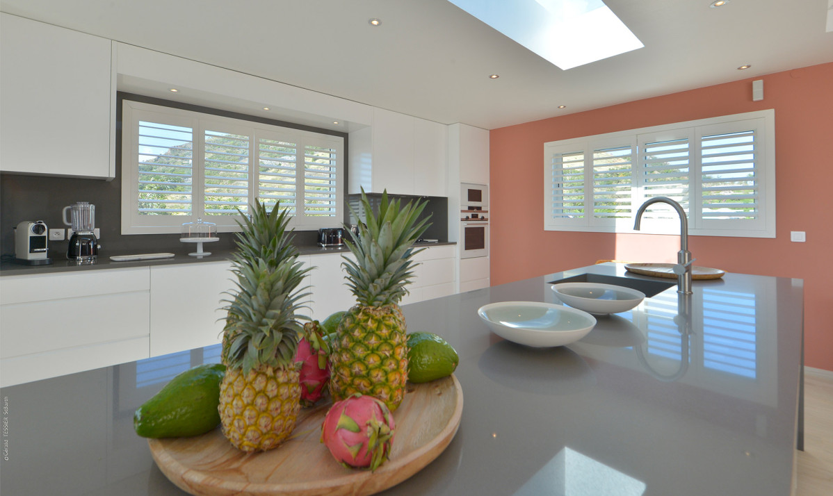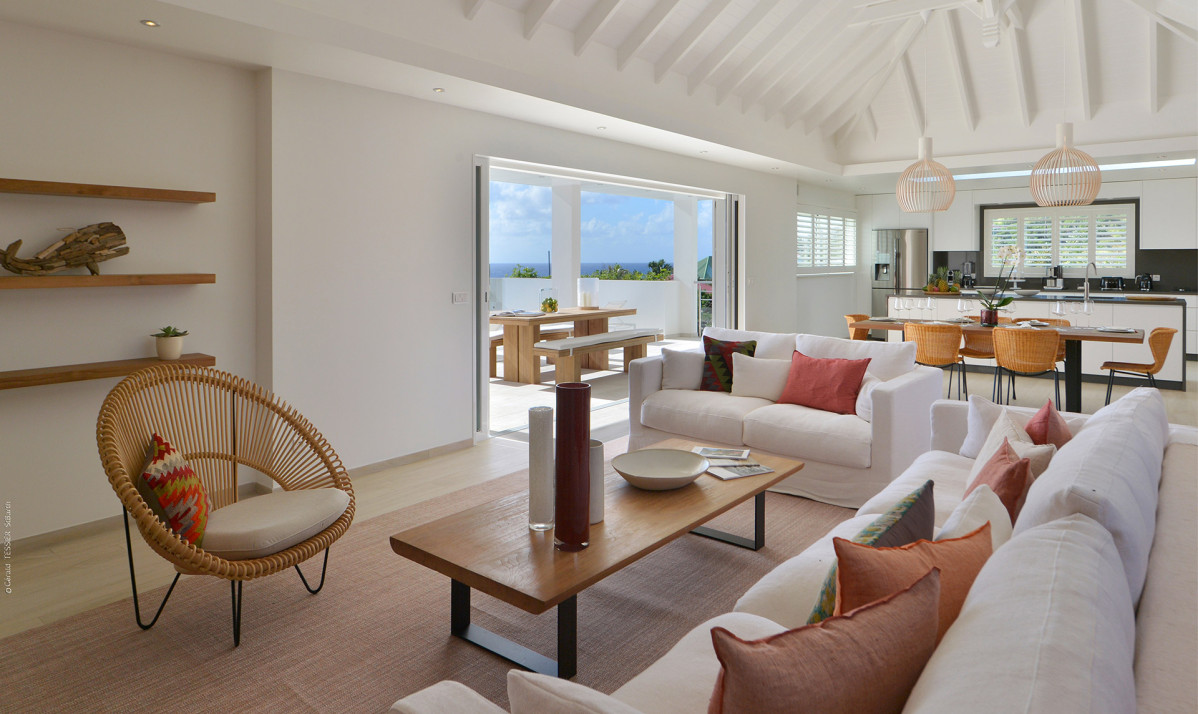 The indoor living room is very spacious. A vaulted white wood ceiling, typical for St Barts, opens the space even more and promotes the bright and welcoming atmosphere, as does the warm color tone along the rear wall. Echoing the setup outside, there is a zone for relaxing and socializing at one end of the room with sofas and a TV, then the indoor dining table. The large and modern kitchen, at the opposite end, is fronted by an island and has everything guests need.