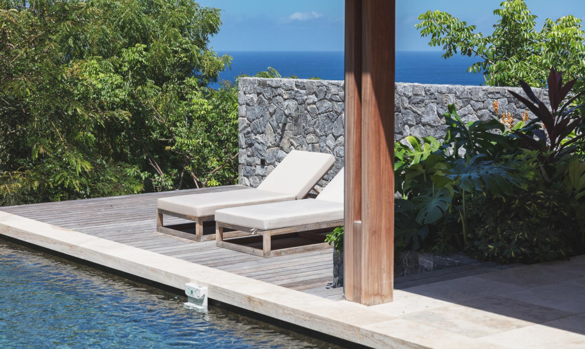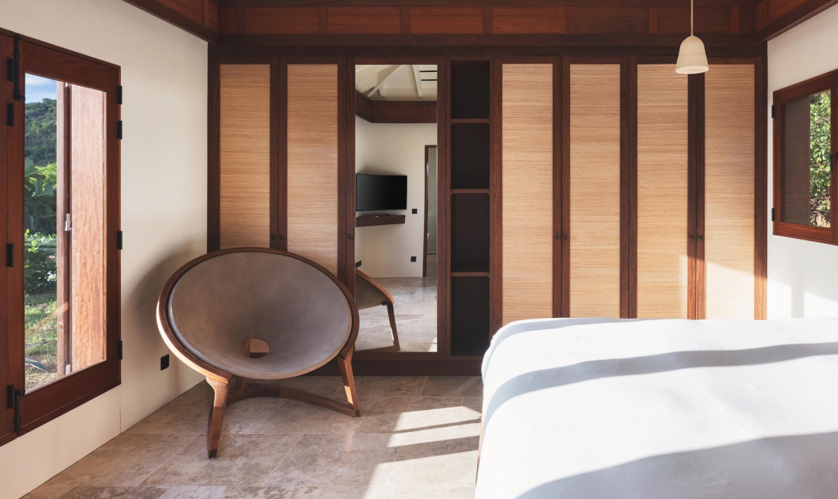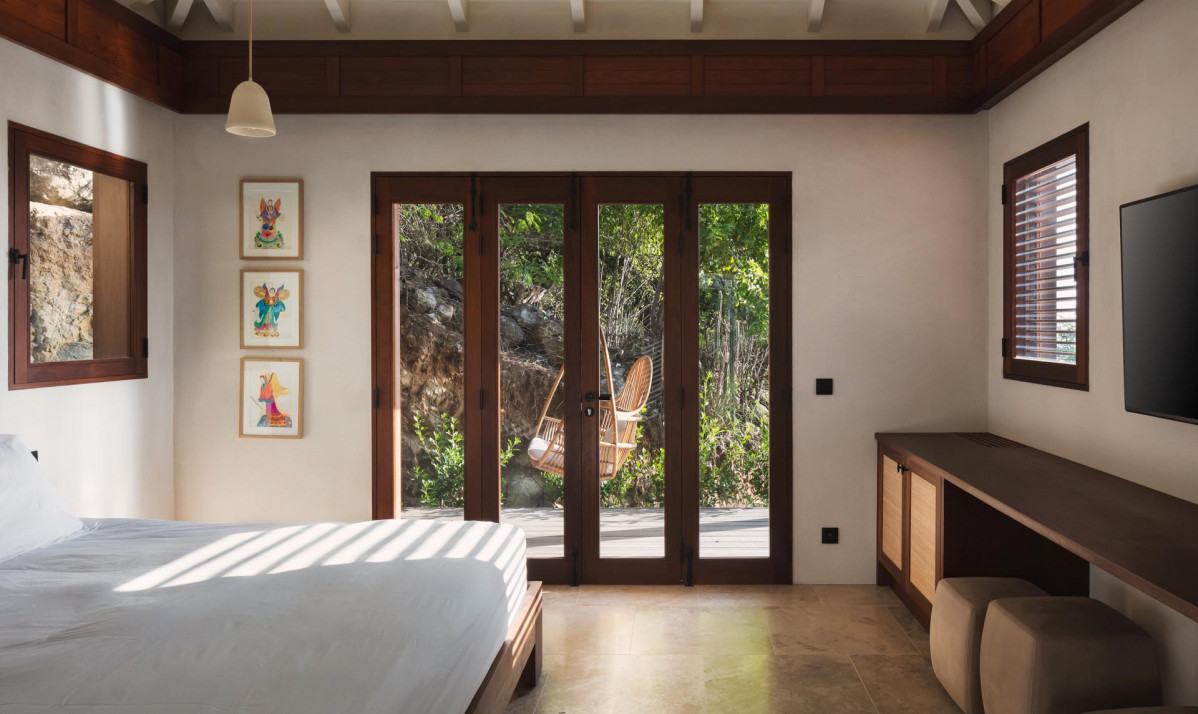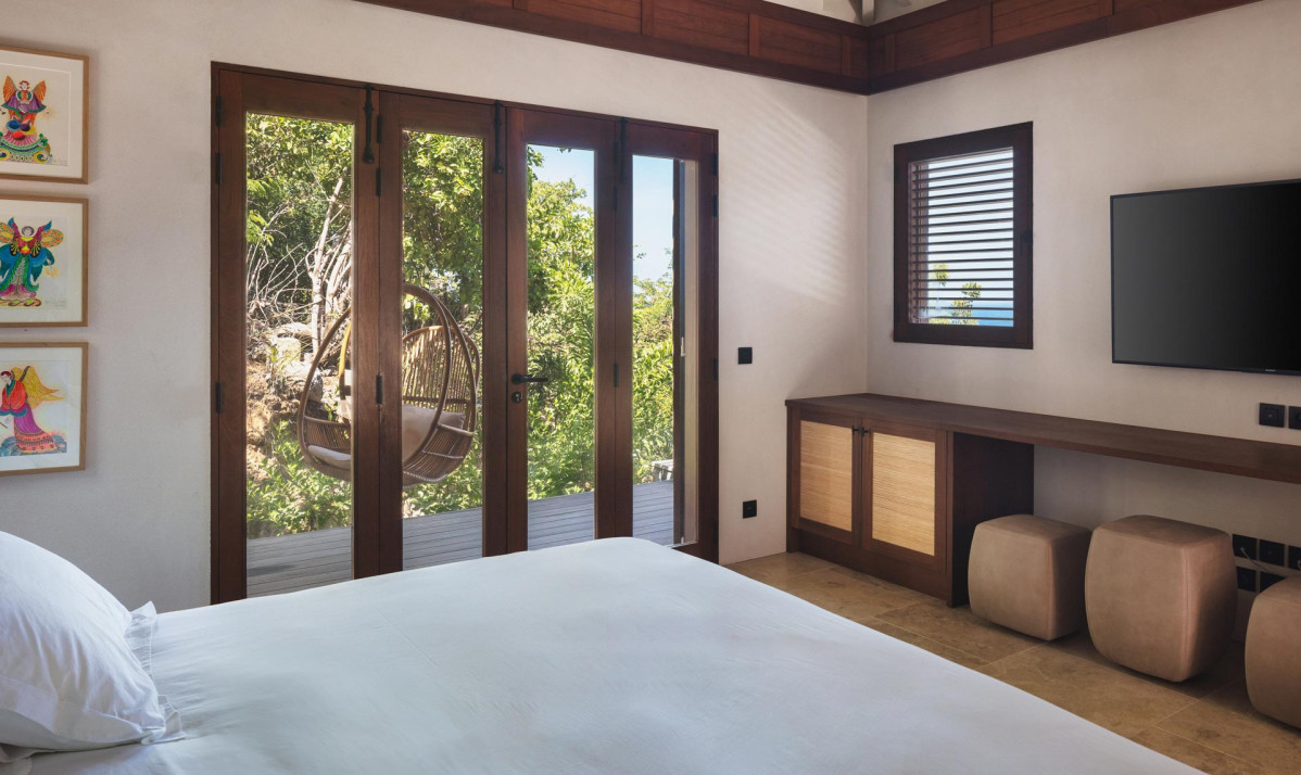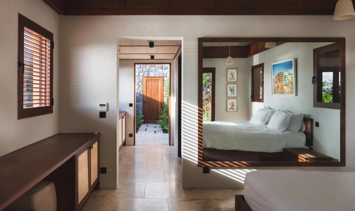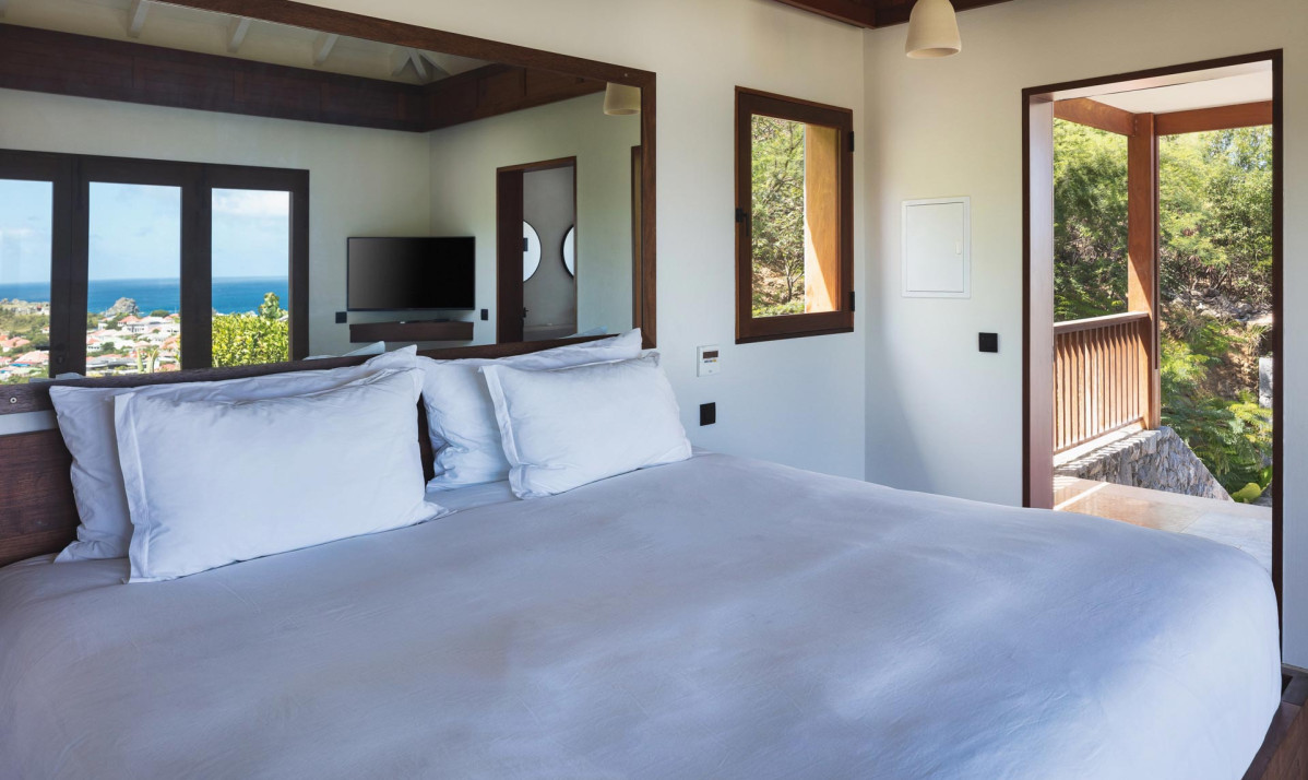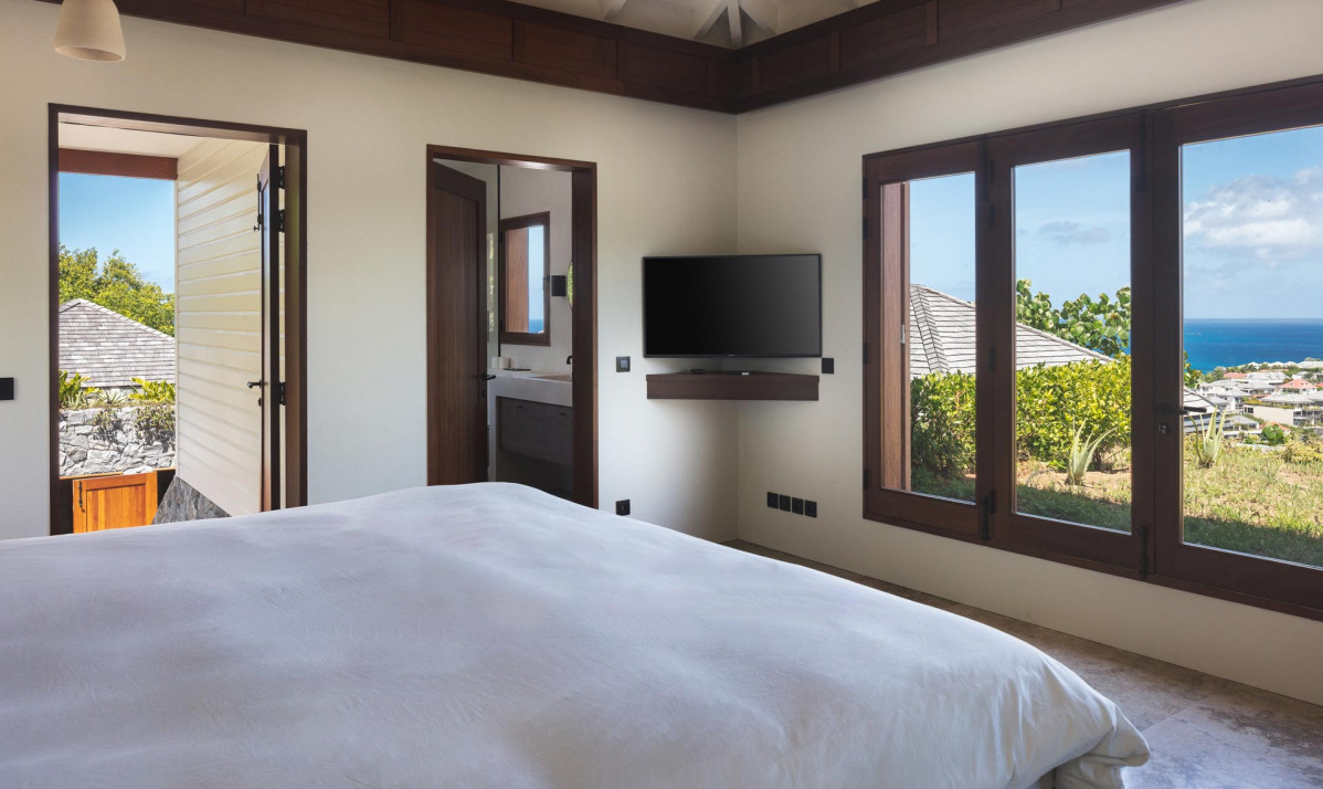 The first bedroom is on the same level as the swimming pool, providing easy access and a relaxing atmosphere. The second bedroom is situated separate building on the upper floor, accessible by exterior stairs, and features a terrace boasting panoramic views of neighboring islands, the ocean, Gustavia, and spectacular sunsets. Both bedrooms are elegantly furnished with plush bedding, large windows for ample natural light, and ensuite bathrooms with modern amenities. Blending contemporary style with island charm, the villa ensures comfort and beauty in every space.
