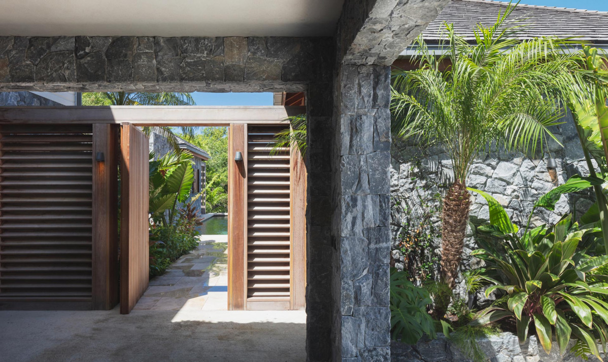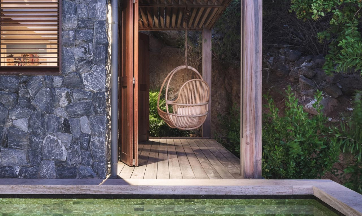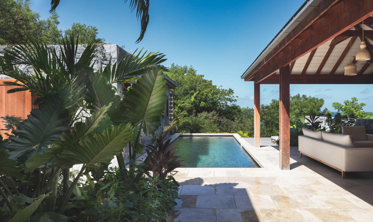 Villa Tulum's exterior showcases a harmonious blend of natural stone and contemporary design. The expansive terrace invites relaxation with comfortable outdoor seating and breathtaking views of Gustavia. A sparkling pool serves as the centerpiece, perfect for leisurely swims under the Caribbean sun. Surrounded by lush tropical landscaping, the property offers serene spaces for dining al fresco or enjoying a sunset cocktail. Thoughtfully designed stone pathways and elegant lighting enhance the inviting ambiance, creating a picturesque setting that embodies the beauty and charm of Saint Barts. The villa's exterior is an oasis of style and tranquility.