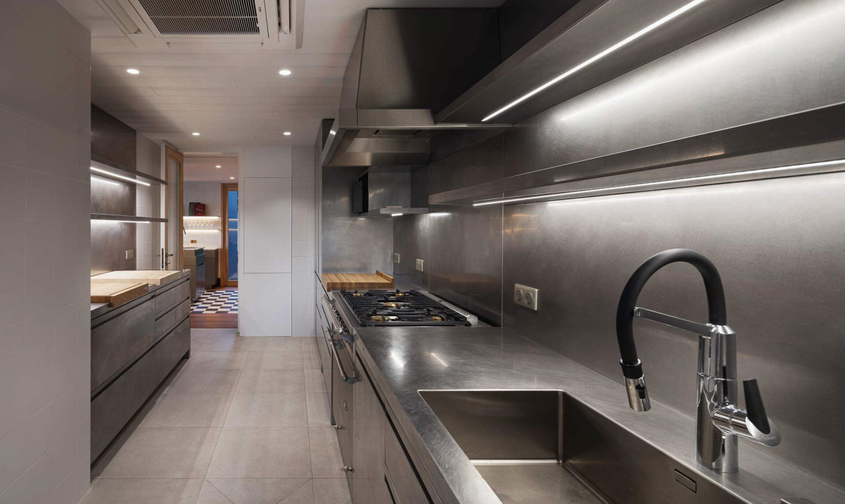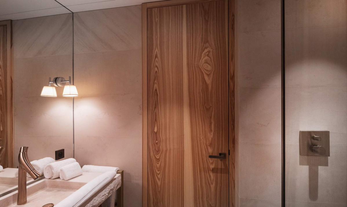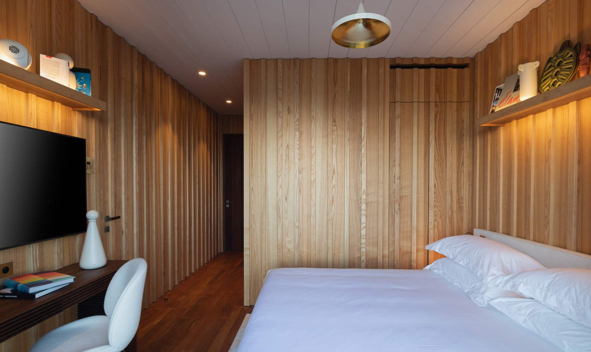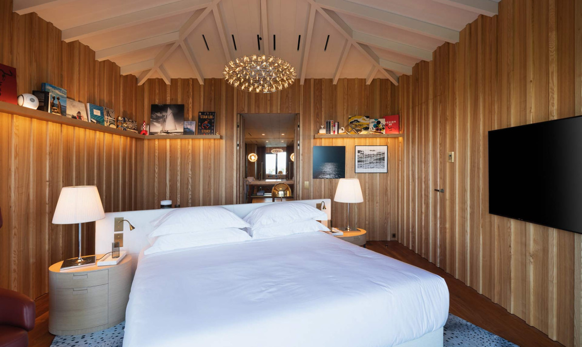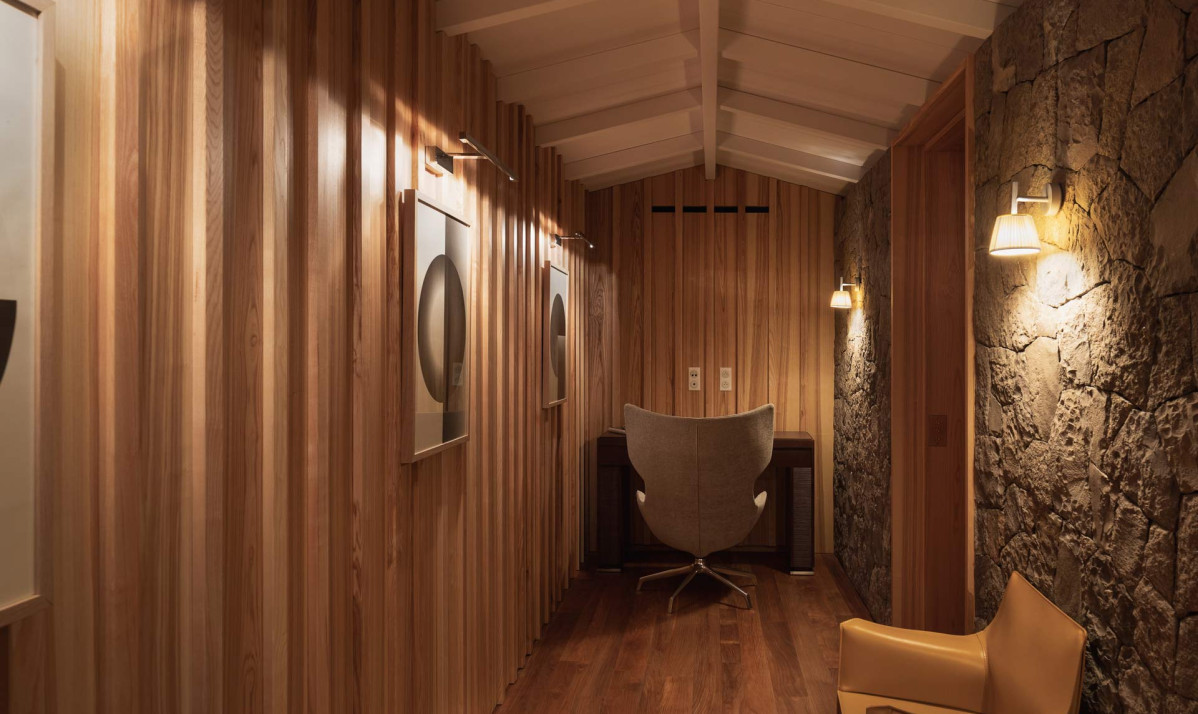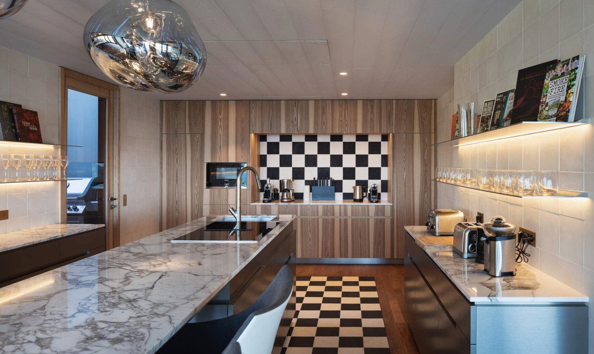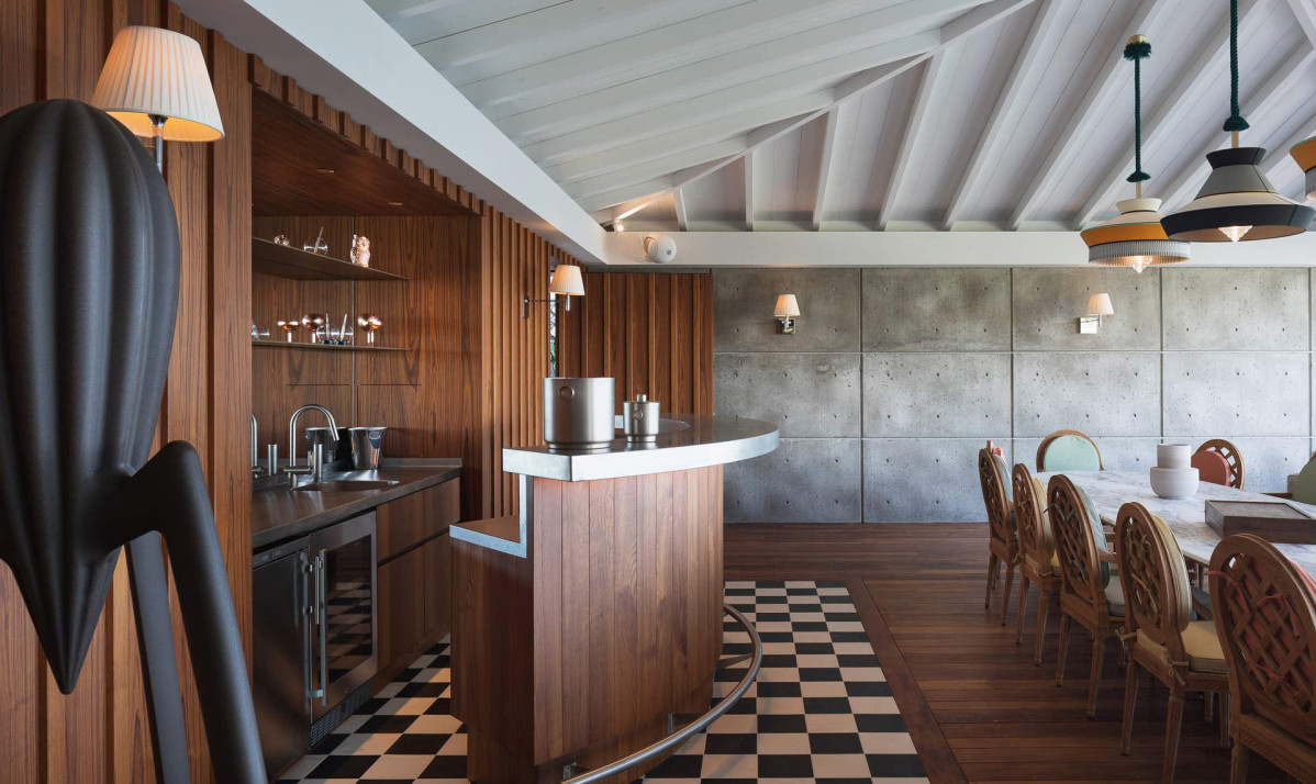 Stepping into the villa, you're immediately enveloped in an atmosphere of refined elegance and soothing comfort. To the right, the main living space unfolds with its rich, wood-paneled walls and sumptuous, oversized sofas, inviting relaxation and social gatherings. The adjacent kitchen, with its striking checkerboard flooring, offers a casual dining setting, complete with a sleek counter and barstools for leisurely breakfasts or quick bites. Beyond this, a hidden gem: a professional-grade kitchen equipped for culinary artistry, ideal for a private chef to craft unforgettable dining experiences. Throughout the property, the interior design is a masterclass in sophistication. Each piece of furniture, lighting fixture, and finish has been chosen for its design-forward appeal, blending functionality with artistic flair.
