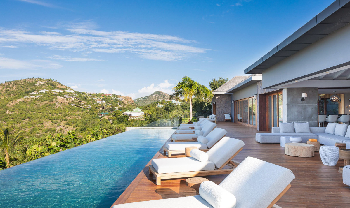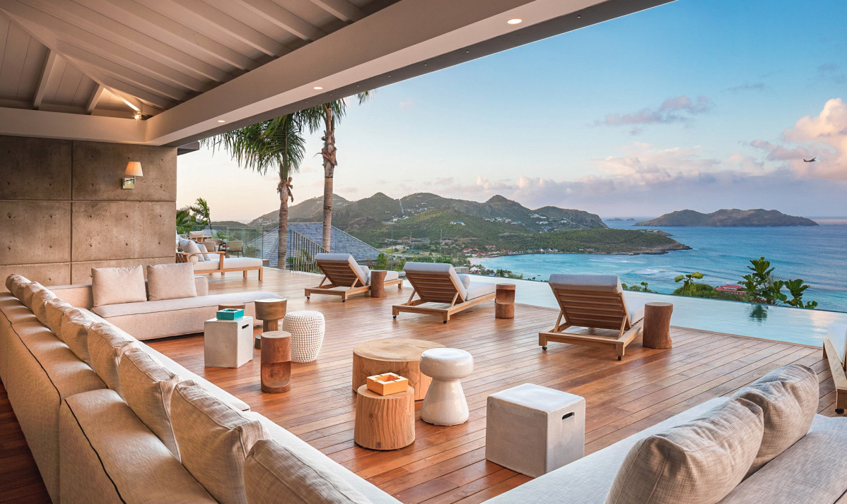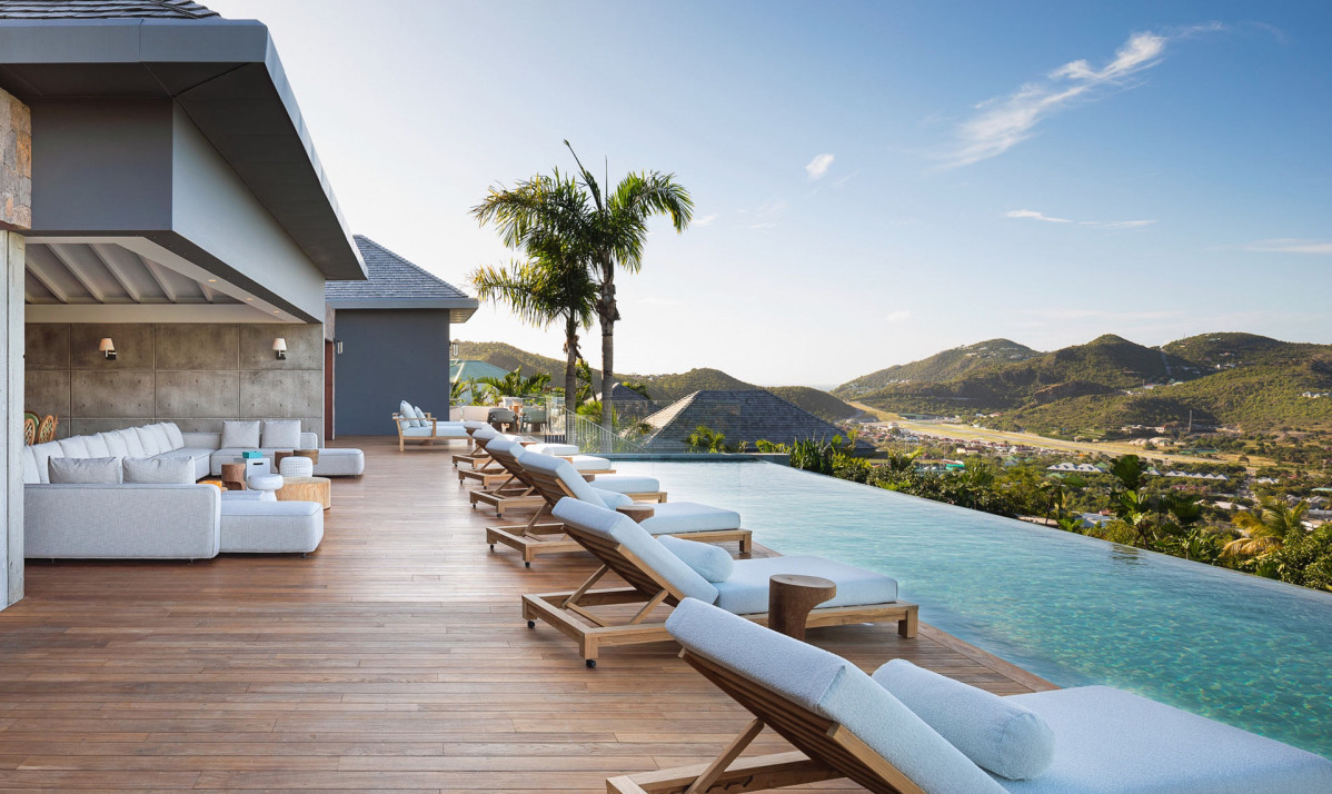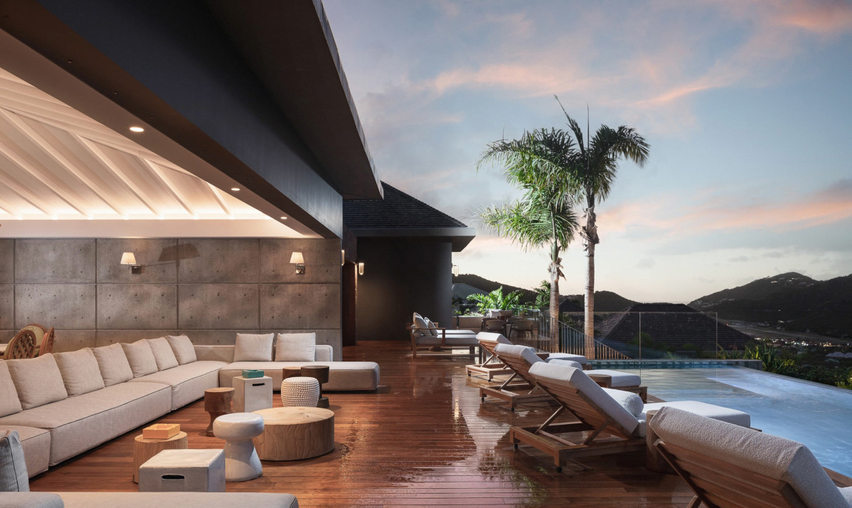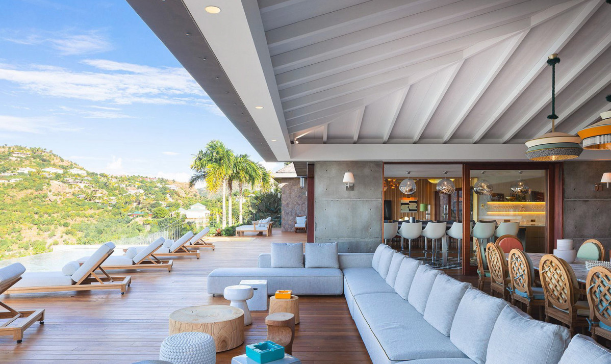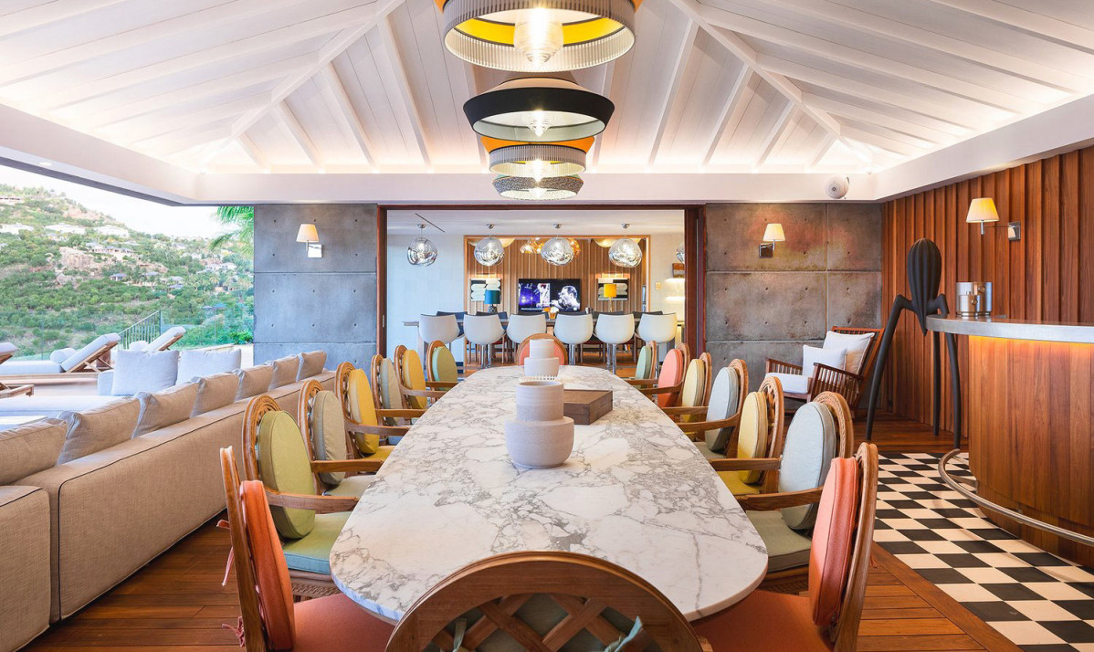 This Saint Barts villa, living up to its reputation, boasts an exceptionally magnificent exterior. Secluded from the bustling roads, a lengthy driveway leads to a spacious parking area, setting the stage for privacy and exclusivity. The first glimpse of the villa reveals an expansive terrace, dominated by a stunning 20-meter-long heated swimming pool and an adjoining mosaic-tiled Jacuzzi, embodying luxury and relaxation with a view. Further enhancing this outdoor haven is an elegant bar area, a sophisticated wine cellar, and a large dining table under the shelter of the terrace, capable of hosting 16 guests, all meticulously designed for an unparalleled outdoor living experience.