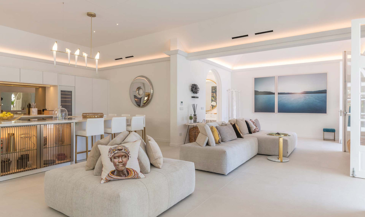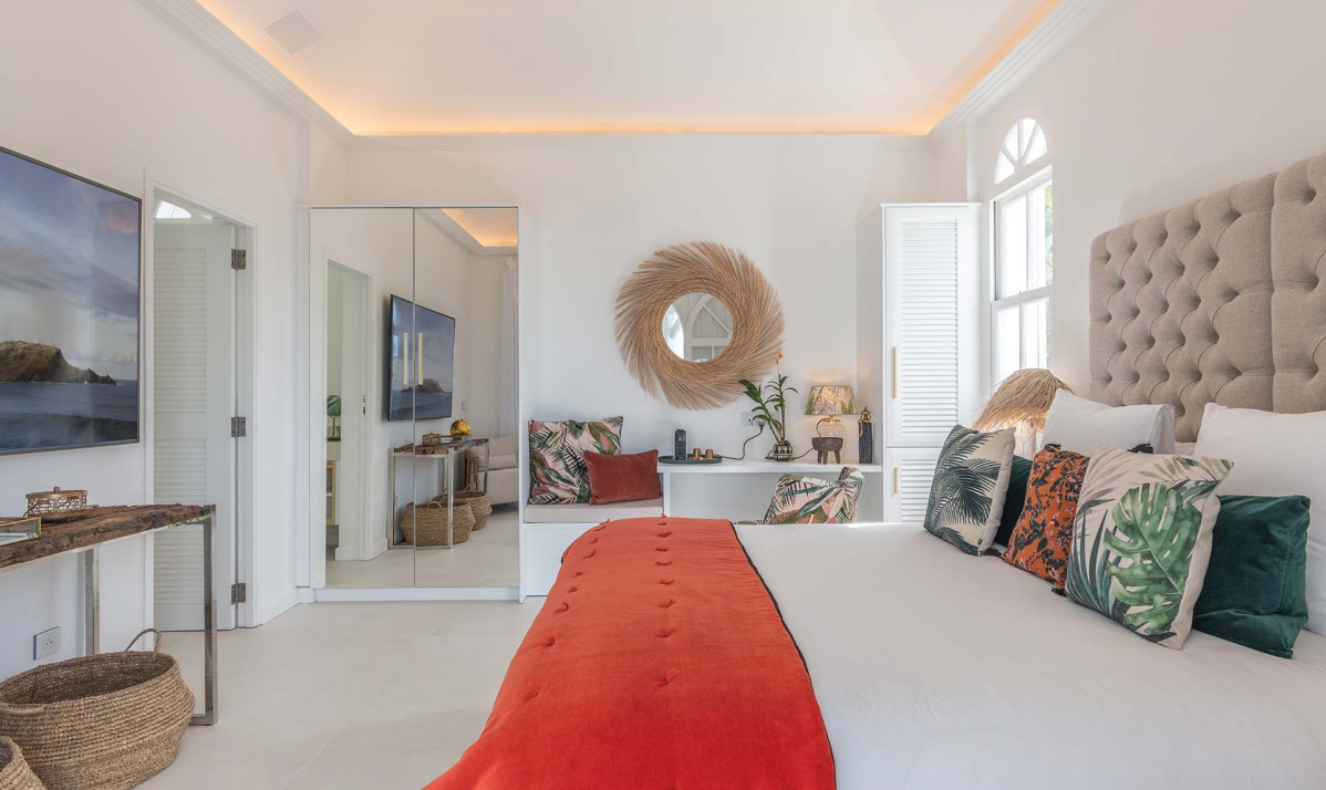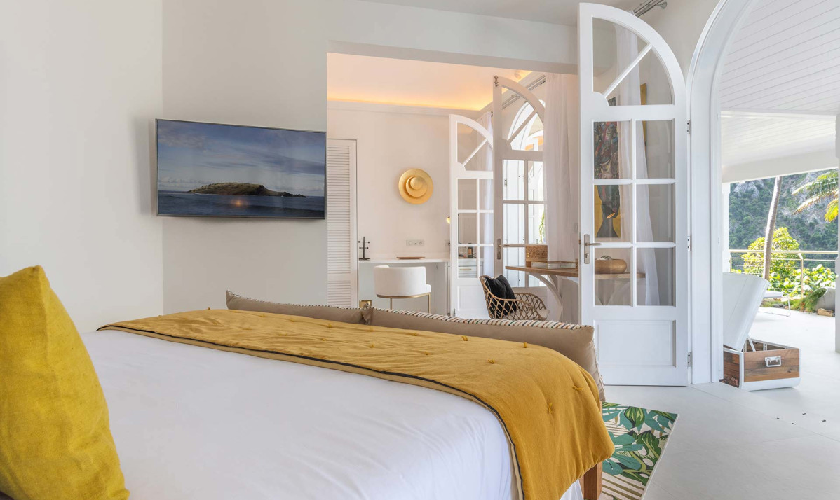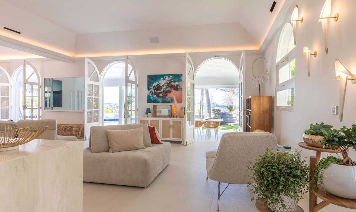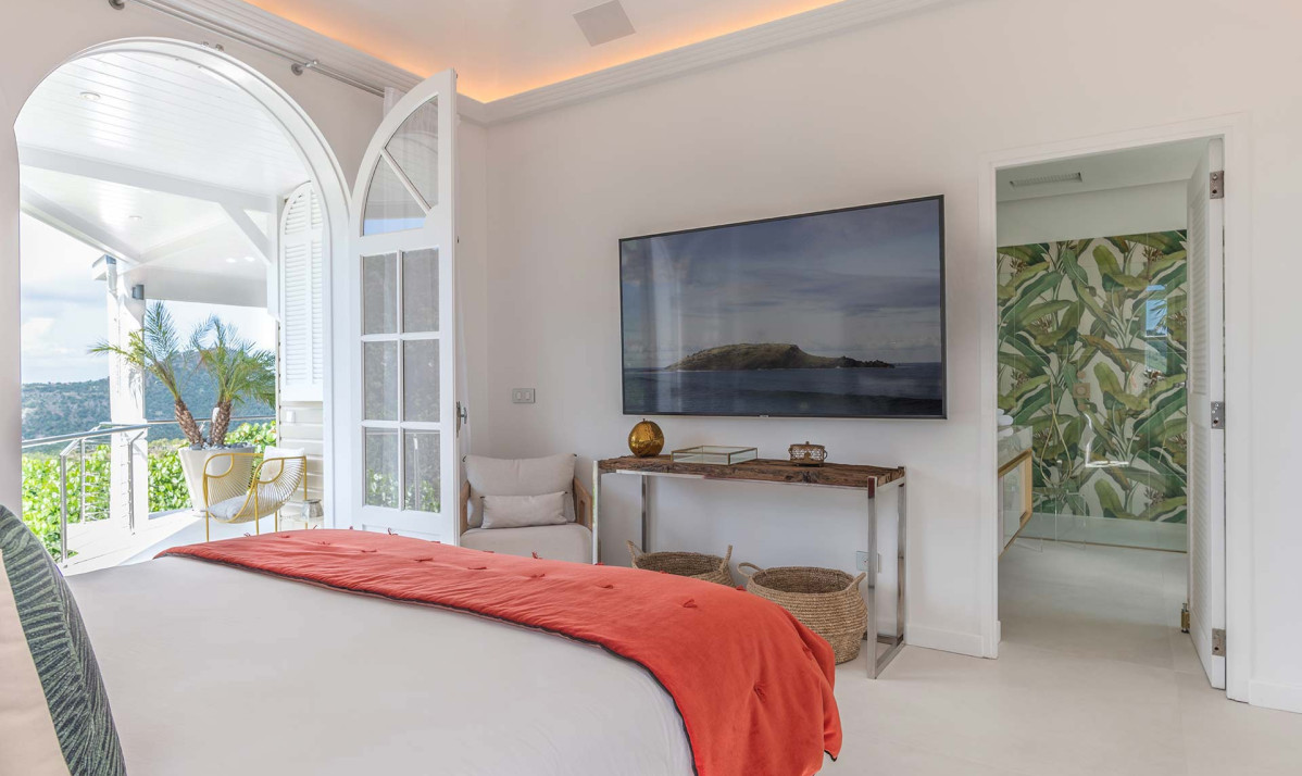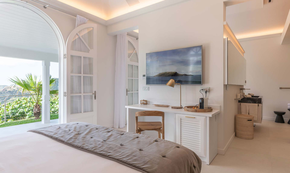 Inside of the property, the interior exudes tranquility and brightness. The main room, blend of the living room and kitchen, features an open-plan design that welcomes the island's gentle breeze through its connection to the outdoor terrace. In the living area, comfortable seating is perfectly positioned for enjoying the view through charming arched doorways, ideal for relaxing with a book or a refreshing drink. A separate TV area provides a cozy setting for movie nights, a delightful way to relax after exploring the bays of Saint Barts. The kitchen, set behind the living space, is a model of contemporary design with sleek cabinetry and minimalist decor, equipped with top-tier appliances for any cooking endeavor.