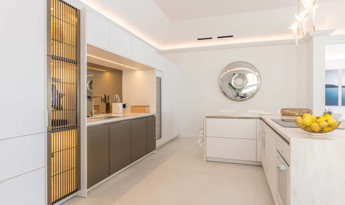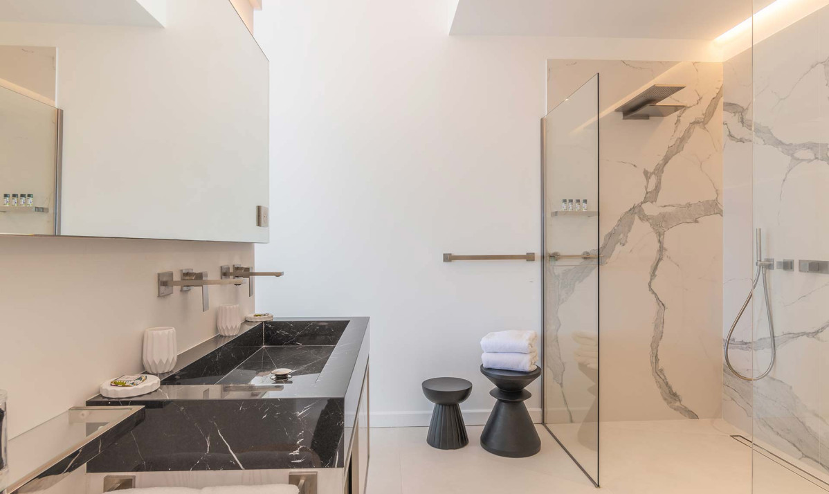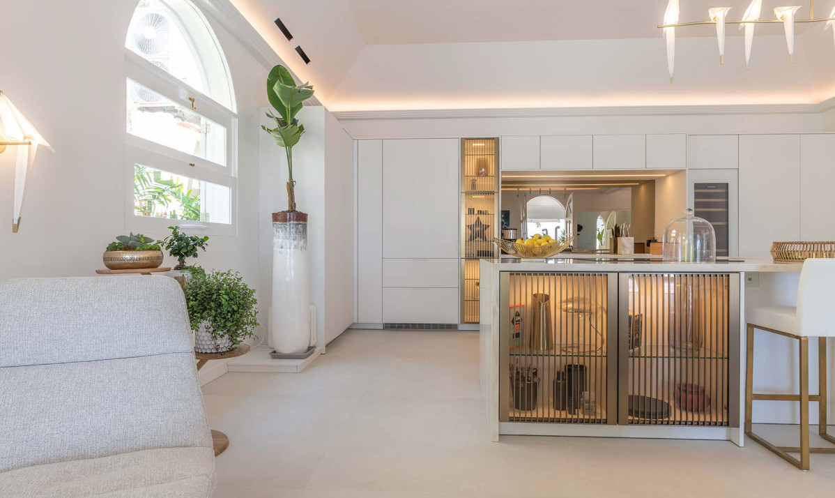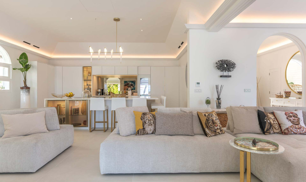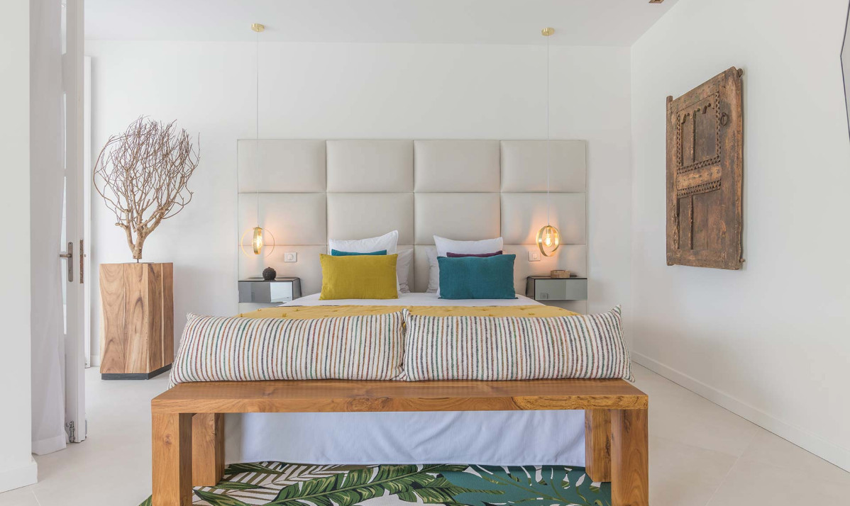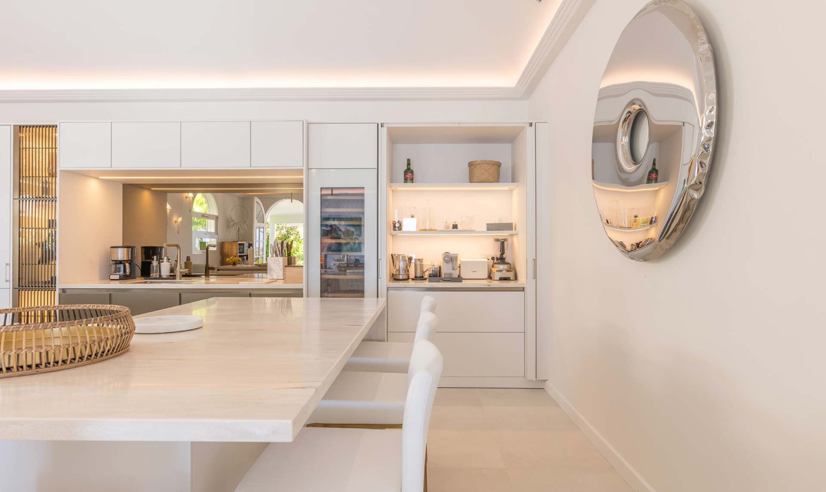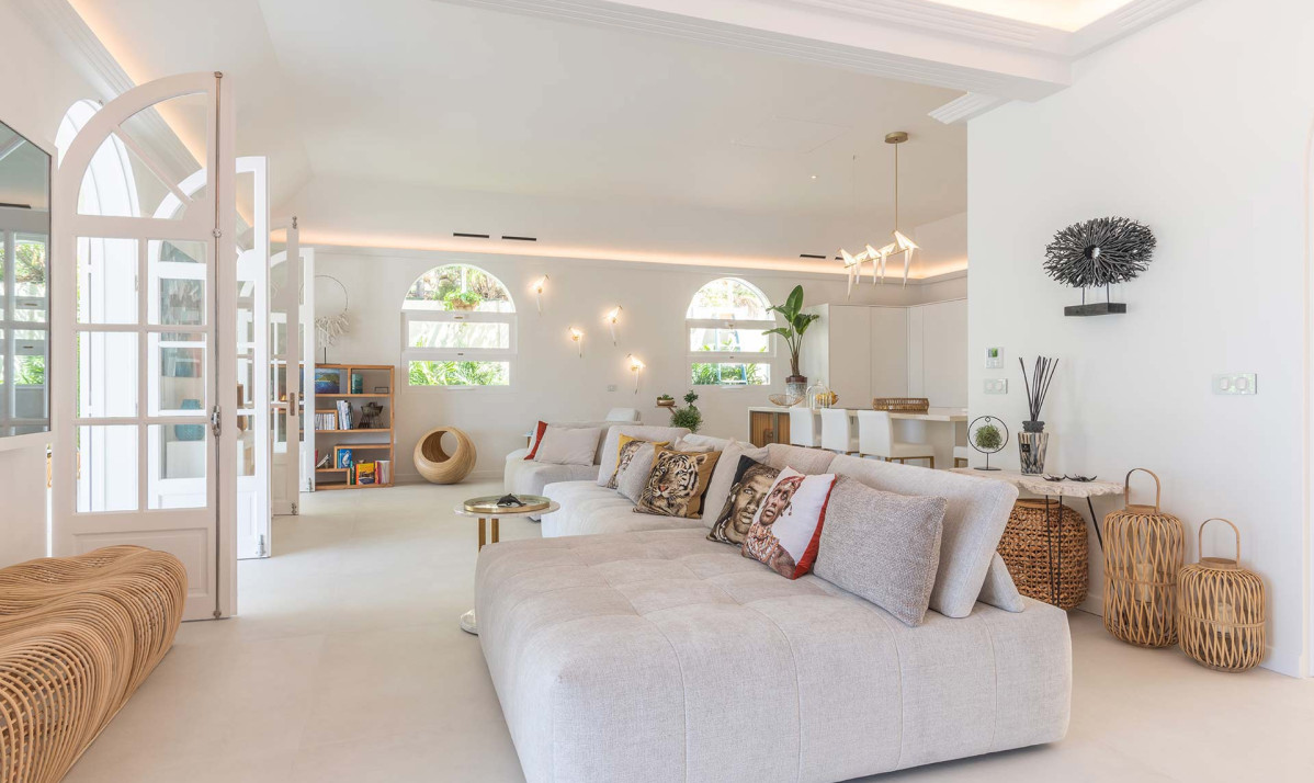Inside of the property, the interior exudes tranquility and brightness. The main room, blend of the living room and kitchen, features an open-plan design that welcomes the island's gentle breeze through its connection to the outdoor terrace. In the living area, comfortable seating is perfectly positioned for enjoying the view through charming arched doorways, ideal for relaxing with a book or a refreshing drink. A separate TV area provides a cozy setting for movie nights, a delightful way to relax after exploring the bays of Saint Barts. The kitchen, set behind the living space, is a model of contemporary design with sleek cabinetry and minimalist decor, equipped with top-tier appliances for any cooking endeavor.