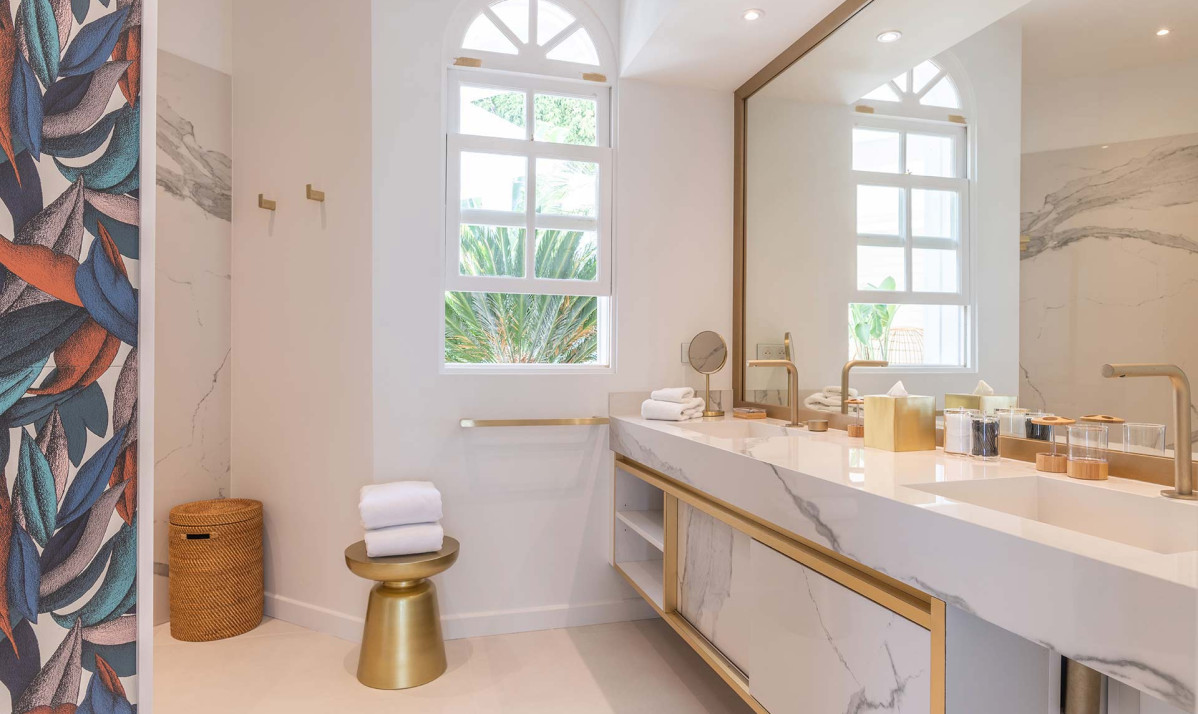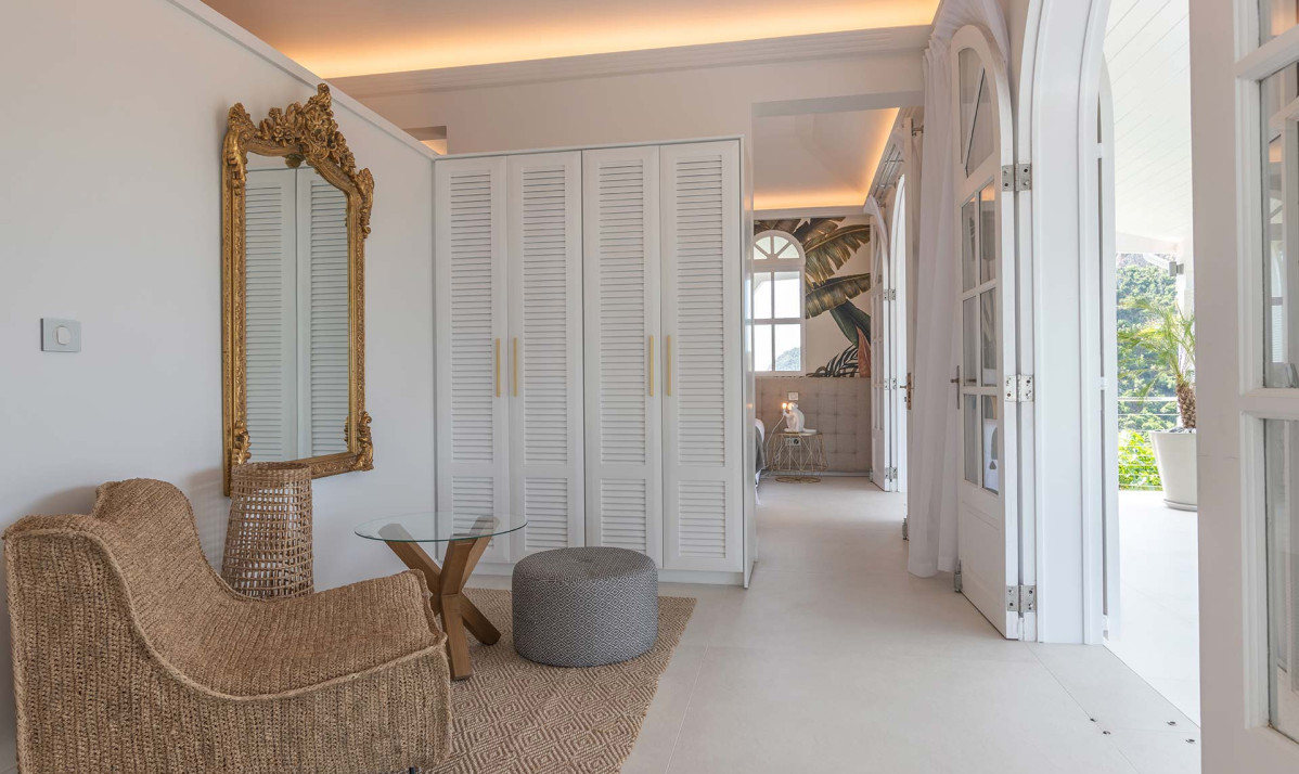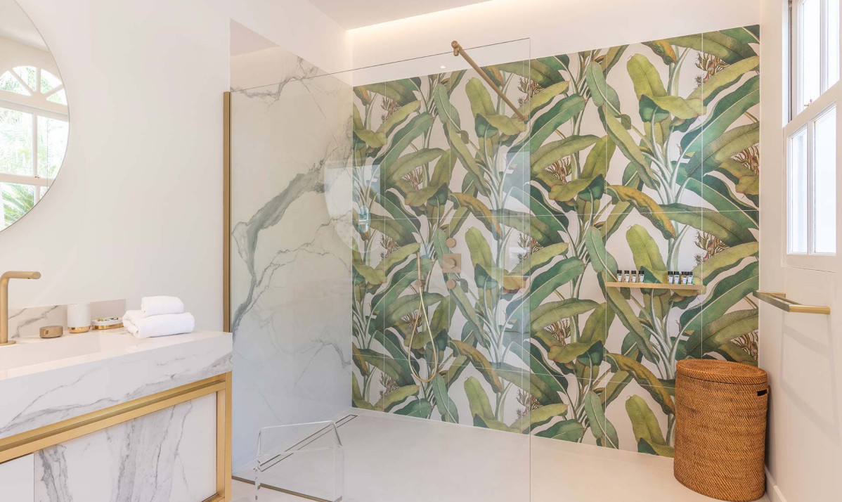 The property features three serene bedrooms, each designed as a peaceful retreat. These rooms are tastefully adorned with tropical accents, like striking jungle-themed prints, that infuse a sense of exotic charm and individuality. Each bedroom boasts a luxurious king-sized bed, ensuring restful slumber. The bedrooms are complemented by private ensuite bathrooms, equipped with both a spacious bath and a large shower, catering to all preferences. For entertainment, flat-screen TVs are provided in each room, offering a selection of U.S. and French satellite channels, along with Apple TV, making them perfect for relaxed evenings or lazy mornings.