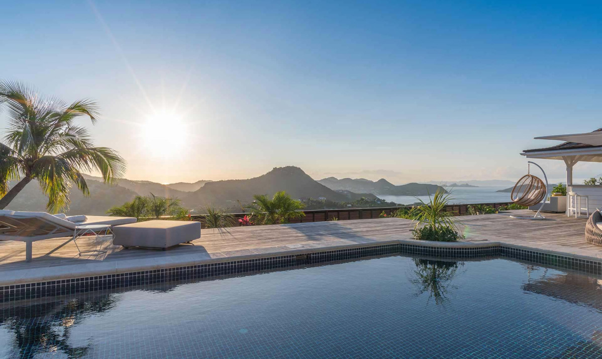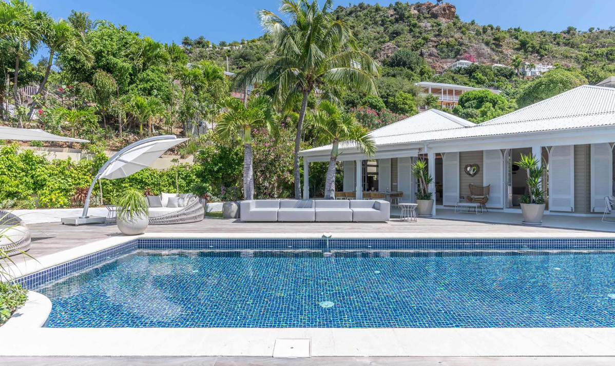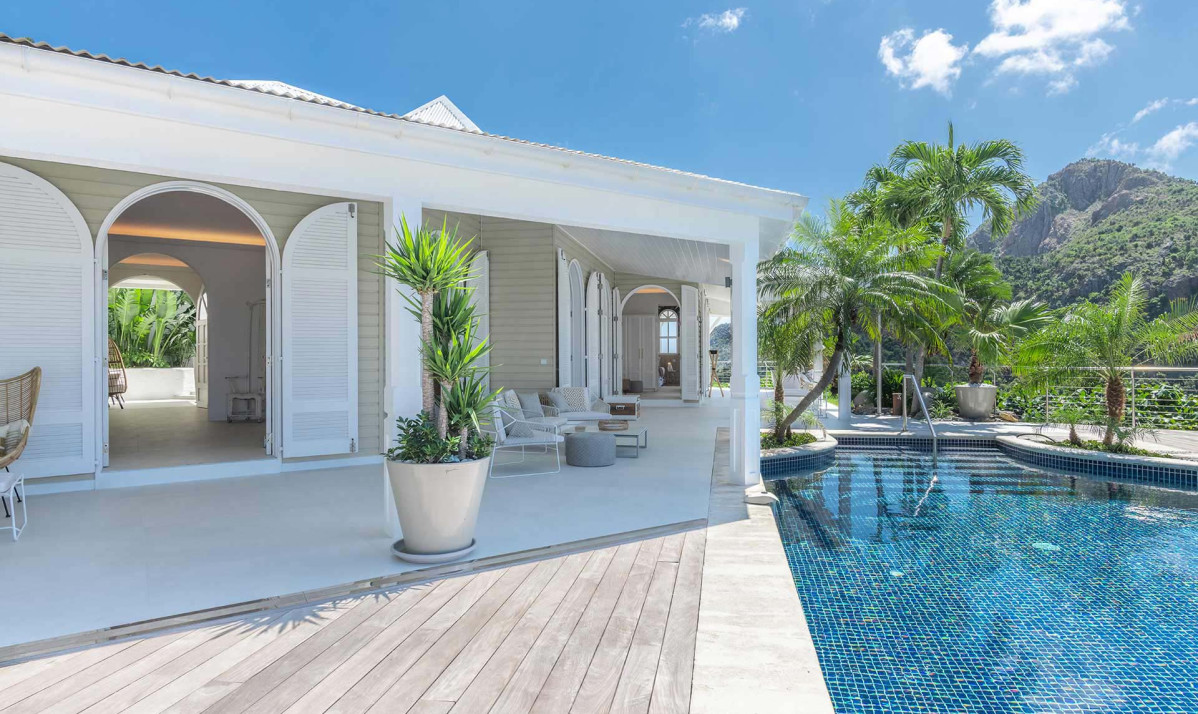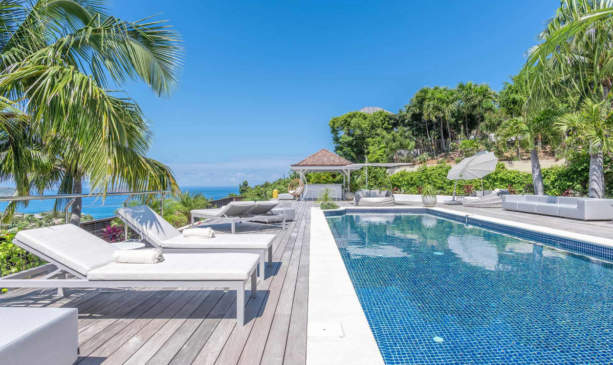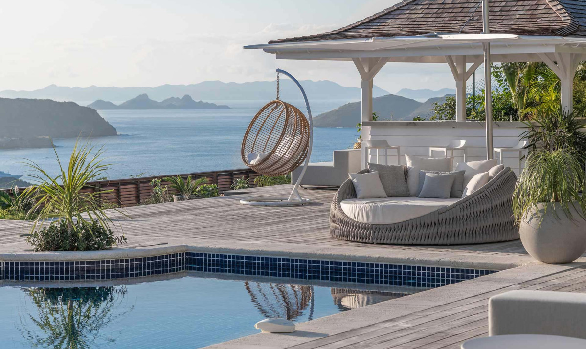 The exterior of the villa elegantly merges its outdoor spaces with the stunning natural surroundings. The garden and terraces offer panoramic views of the mountains and ocean, creating a quintessential Saint Barts experience, especially during unforgettable sunsets. A covered terrace wraps around the villa, featuring shady seating with wicker armchairs, daybeds, and swinging seats for relaxation. The highlight is the heated 55-foot pool, perfect for laps and accessible via steps. A gazebo at the terrace's end features an outdoor kitchen with a grill and plancha, ideal for hosting 6 guests. Loungers, plush daybeds, and a lounge area near the pool provide the perfect setting for sunbathing, naps, or enjoying sunset drinks.