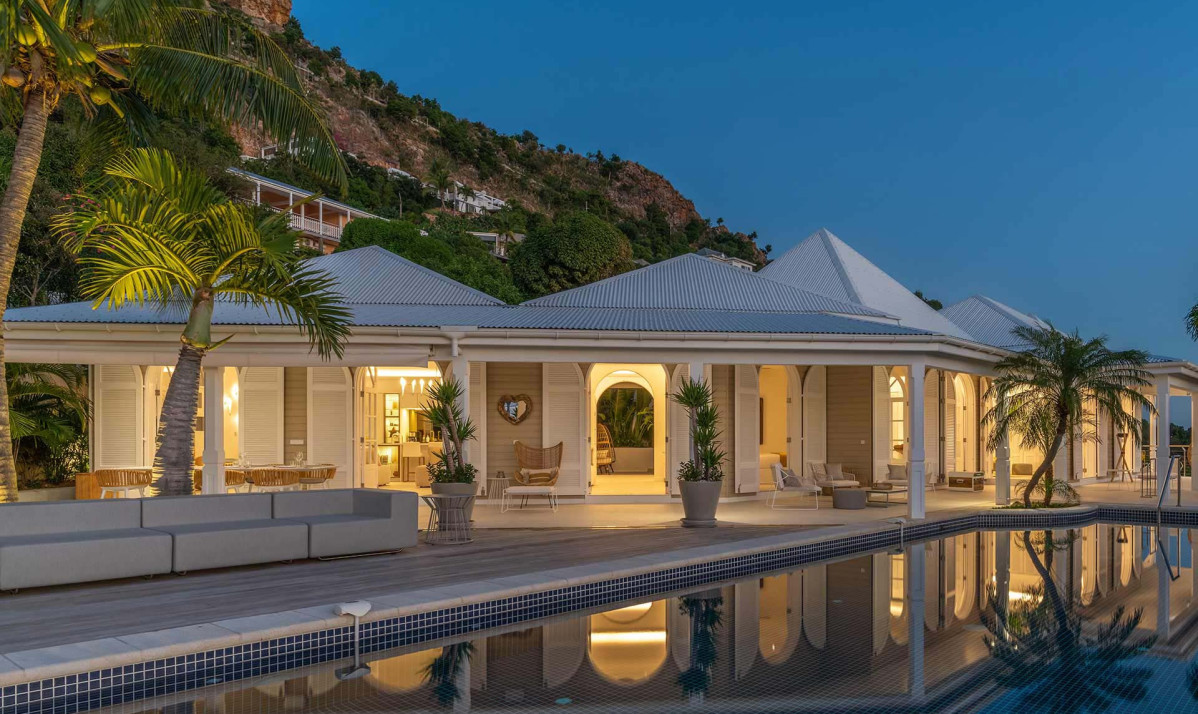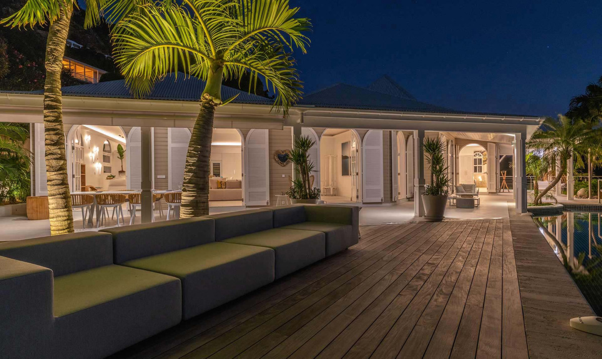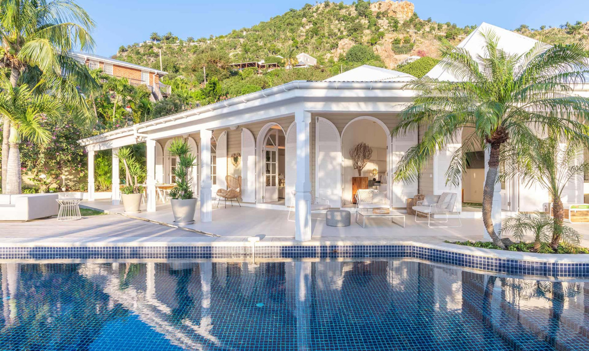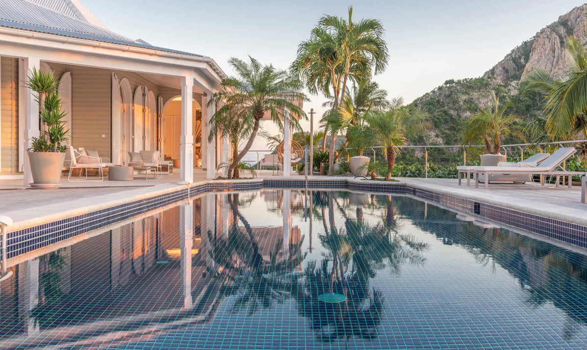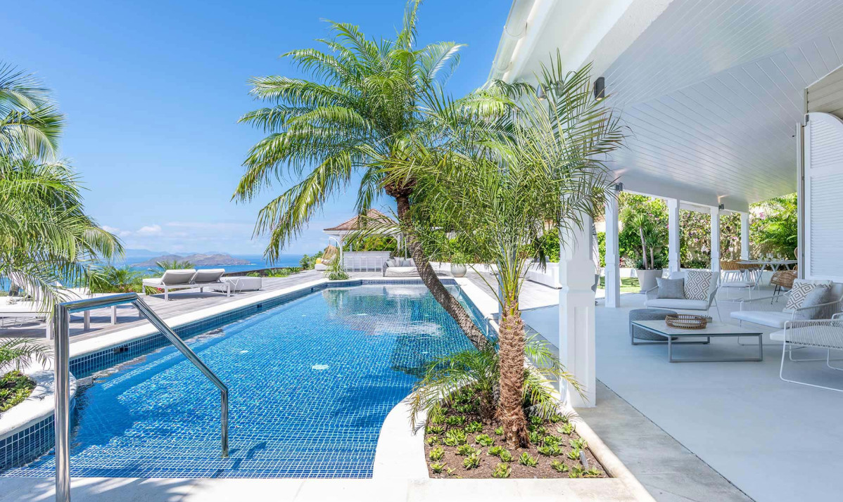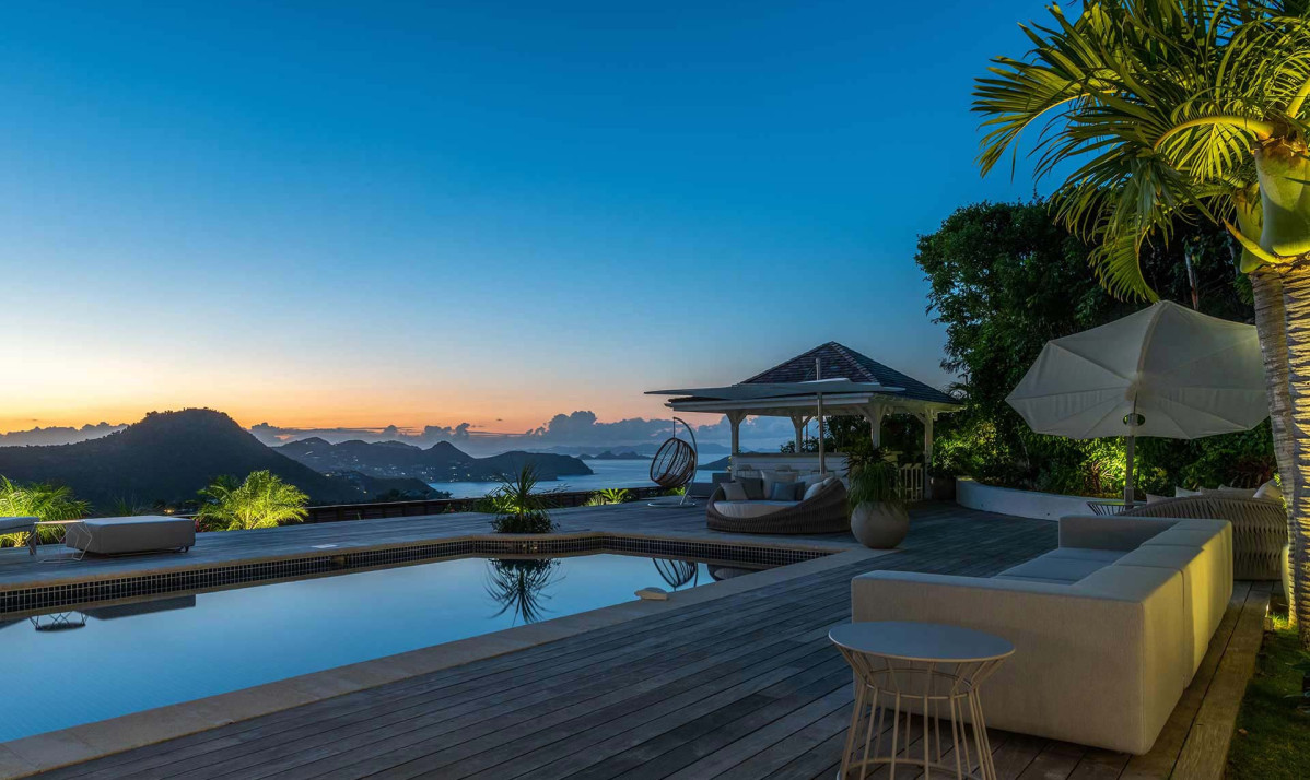 The exterior of the villa elegantly merges its outdoor spaces with the stunning natural surroundings. The garden and terraces offer panoramic views of the mountains and ocean, creating a quintessential Saint Barts experience, especially during unforgettable sunsets. A covered terrace wraps around the villa, featuring shady seating with wicker armchairs, daybeds, and swinging seats for relaxation. The highlight is the heated 55-foot pool, perfect for laps and accessible via steps. A gazebo at the terrace's end features an outdoor kitchen with a grill and plancha, ideal for hosting 6 guests. Loungers, plush daybeds, and a lounge area near the pool provide the perfect setting for sunbathing, naps, or enjoying sunset drinks.