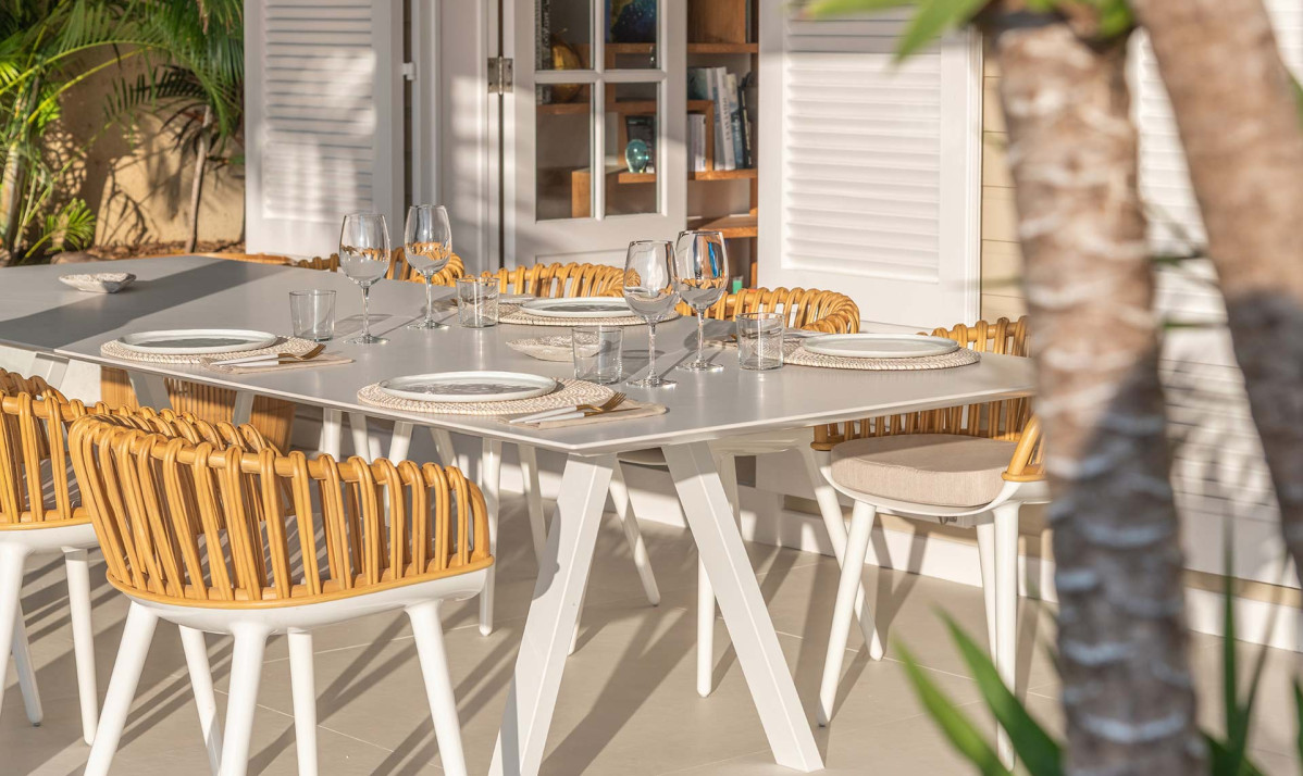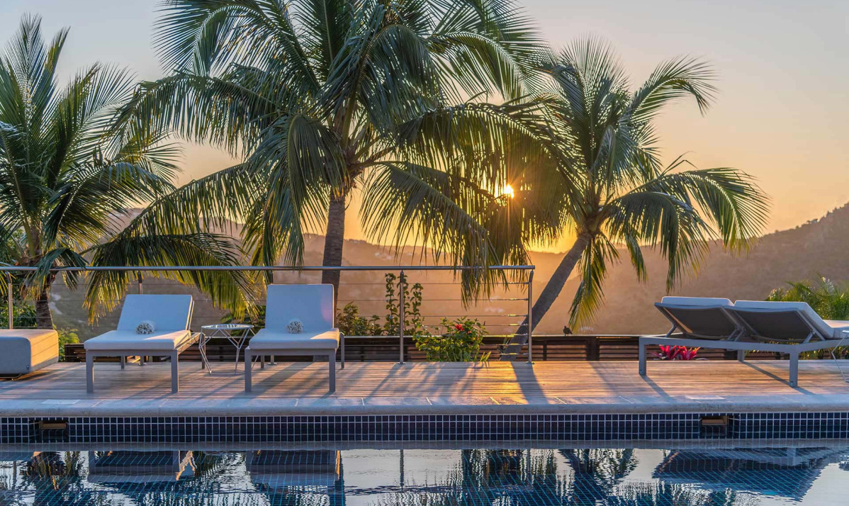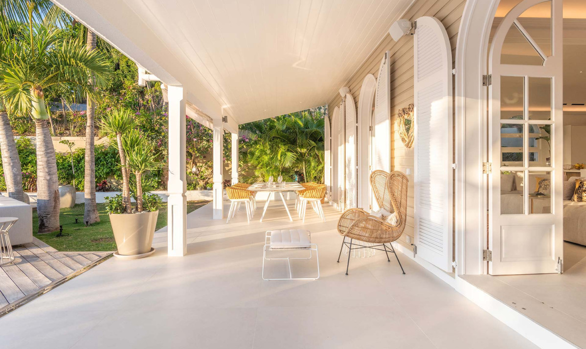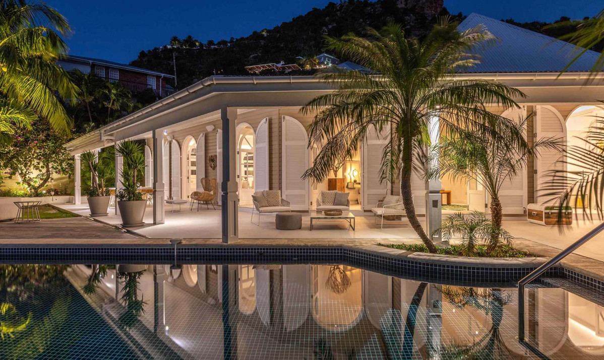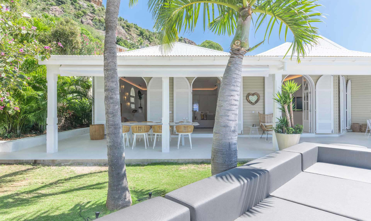 The exterior of the villa elegantly merges its outdoor spaces with the stunning natural surroundings. The garden and terraces offer panoramic views of the mountains and ocean, creating a quintessential Saint Barts experience, especially during unforgettable sunsets. A covered terrace wraps around the villa, featuring shady seating with wicker armchairs, daybeds, and swinging seats for relaxation. The highlight is the heated 55-foot pool, perfect for laps and accessible via steps. A gazebo at the terrace's end features an outdoor kitchen with a grill and plancha, ideal for hosting 6 guests. Loungers, plush daybeds, and a lounge area near the pool provide the perfect setting for sunbathing, naps, or enjoying sunset drinks.